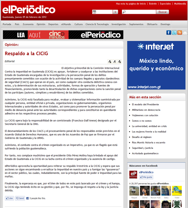 El Periódico would also like to reiterate its unbridled support for CICIG and we hope its efforts continue to work towards eradicating impunity in our country and removing all the "bad eggs" from the public sector, which is undoubtedly the main source of power and impunity for the mafiosi.