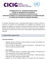 Guatemala, mayo 17 de 2012. La Comisión Internacional contra la Impunidad (CICIG) elaboró el presente informe en virtud de una solicitud de la Vicepresidente de la República de Guatemala, con el propósito de colaborar en el proceso de elección del Secretario General de la Secretaría Nacional de Administración de Bienes en Extinción de Dominio de la que se espera su contribución en la lucha contra la acción de los cuerpos ilegales y aparatos clandestinos de seguridad.