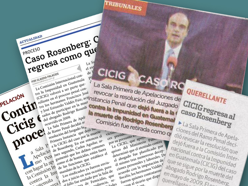 Guatemala, enero 29 de 2015. La Sala Segunda de Apelaciones del ramo Penal confirmó a la CICIG como querellante adhesiva en el caso Rosenberg, con lo cual dejó sin efecto el fallo del Juzgado Segundo de Instancia Penal que había rechazado la intervención de la Comisión para continuar en este proceso.