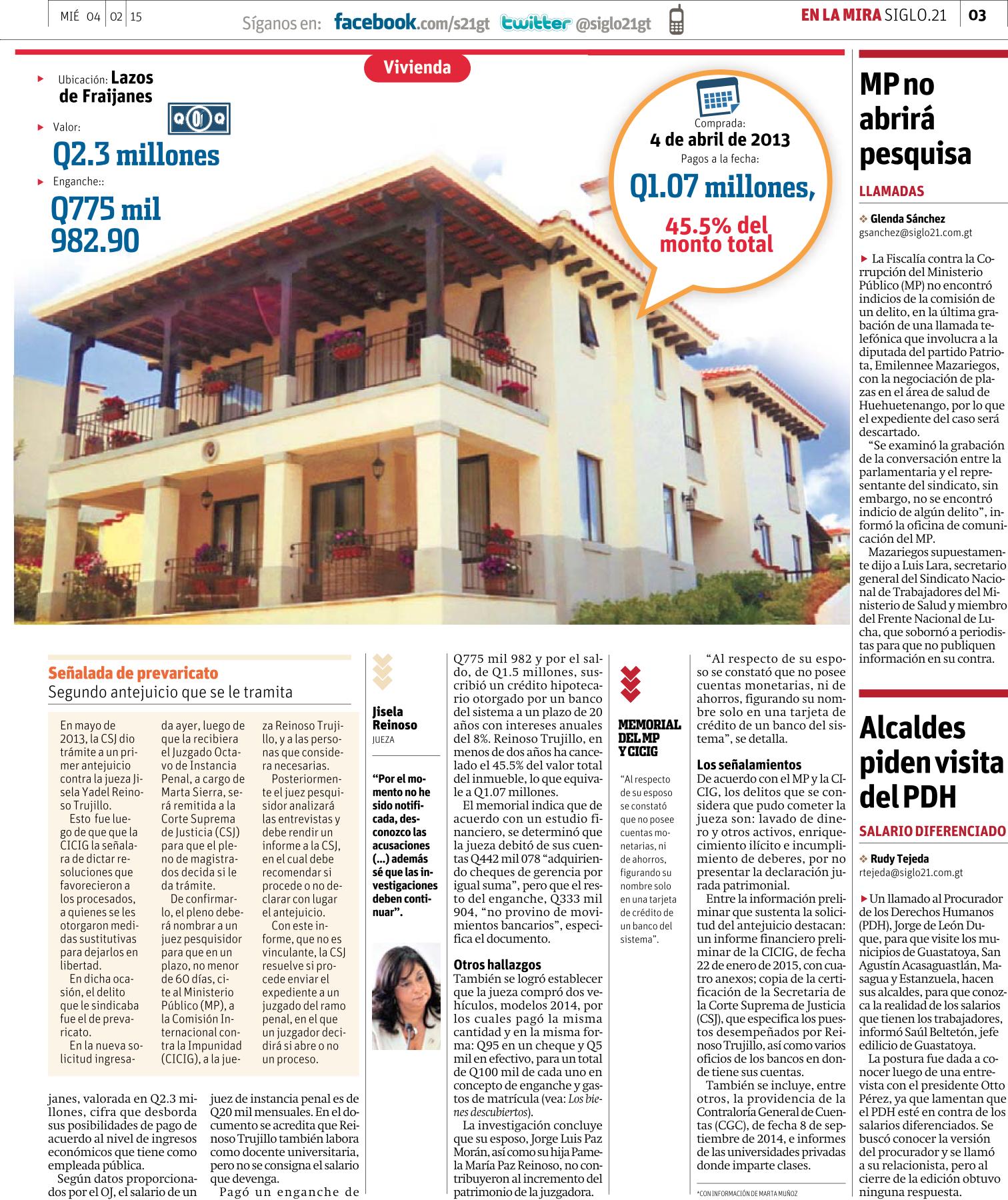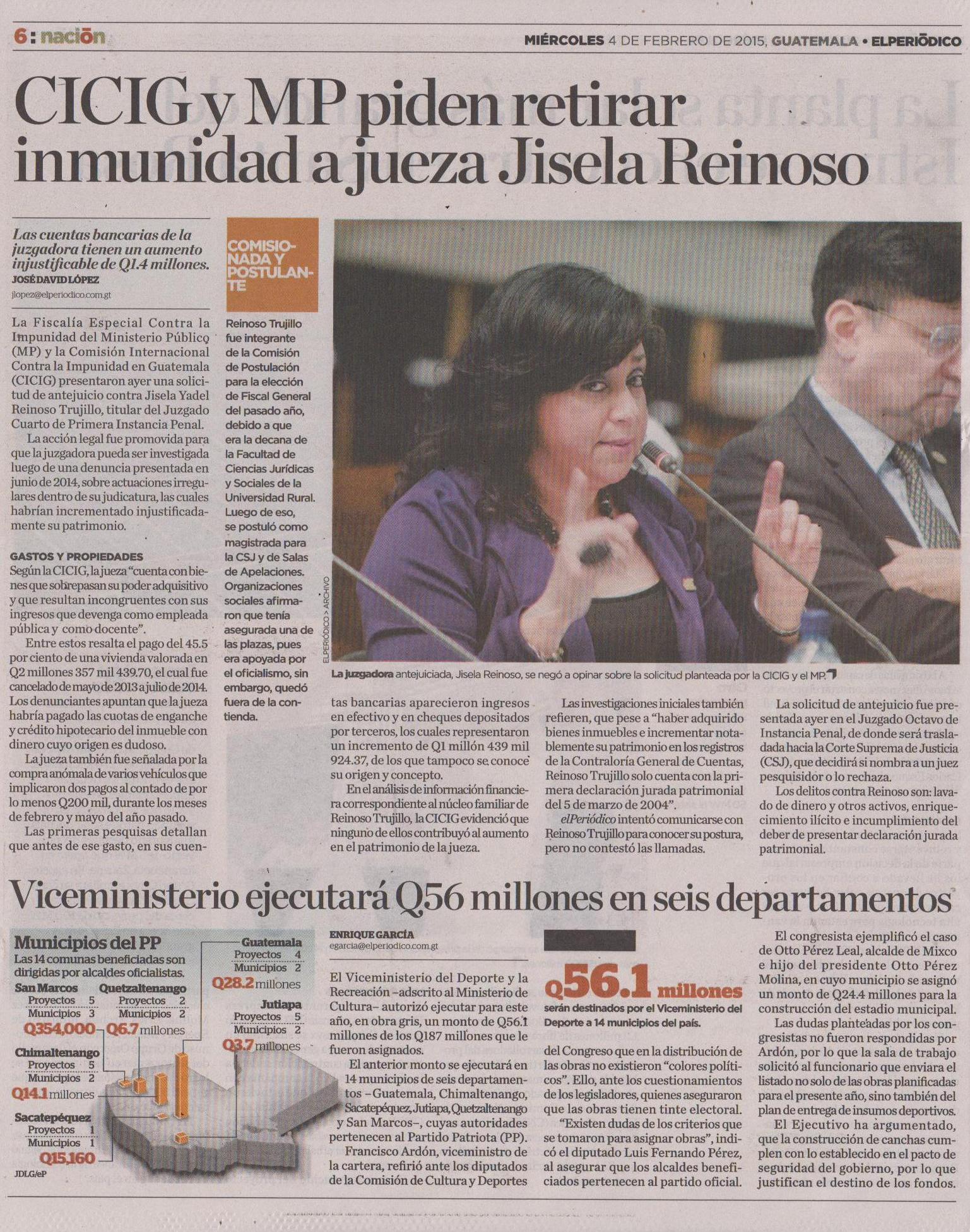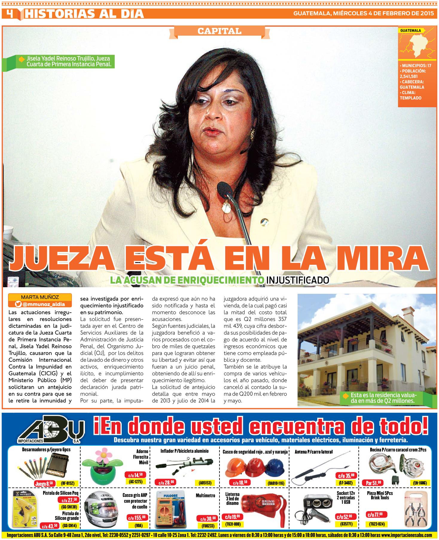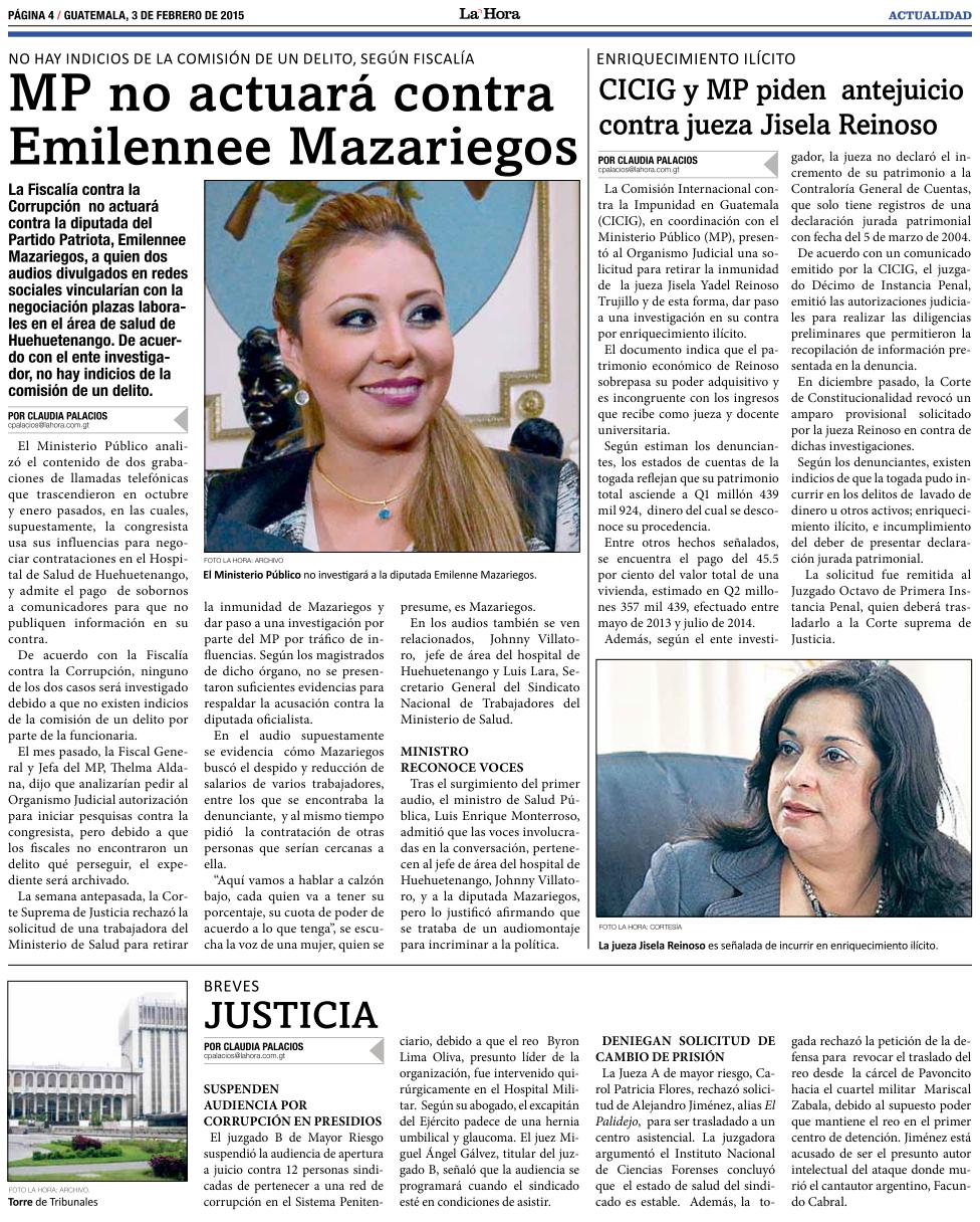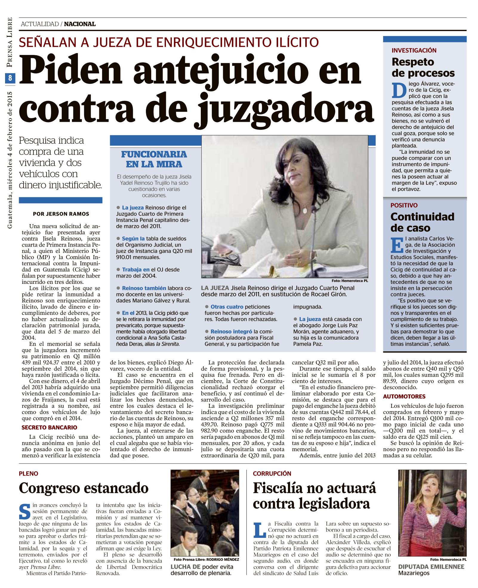 Guatemala, febrero 04 de 2015. Los medios de comunicación destacaron la noticia sobre la solicitud de antejuicio presentada por la CICIG y el Ministerio Público contra la jueza Jisela Yadel Reinoso Trujillo, con el fin de que se le investigue por el incremento injustificado de su patrimonio. (Se publica con fines informativos).