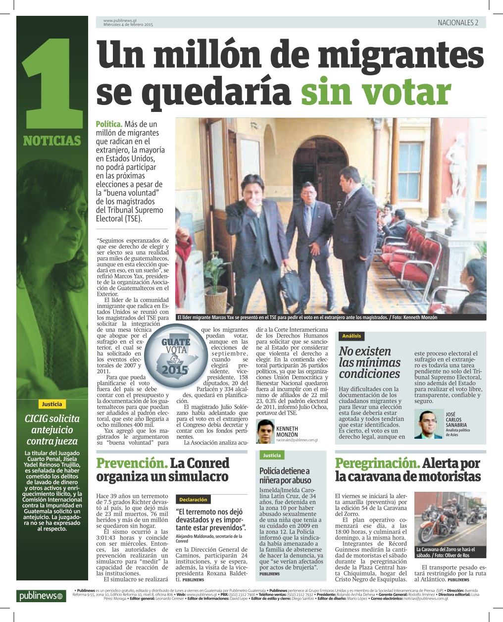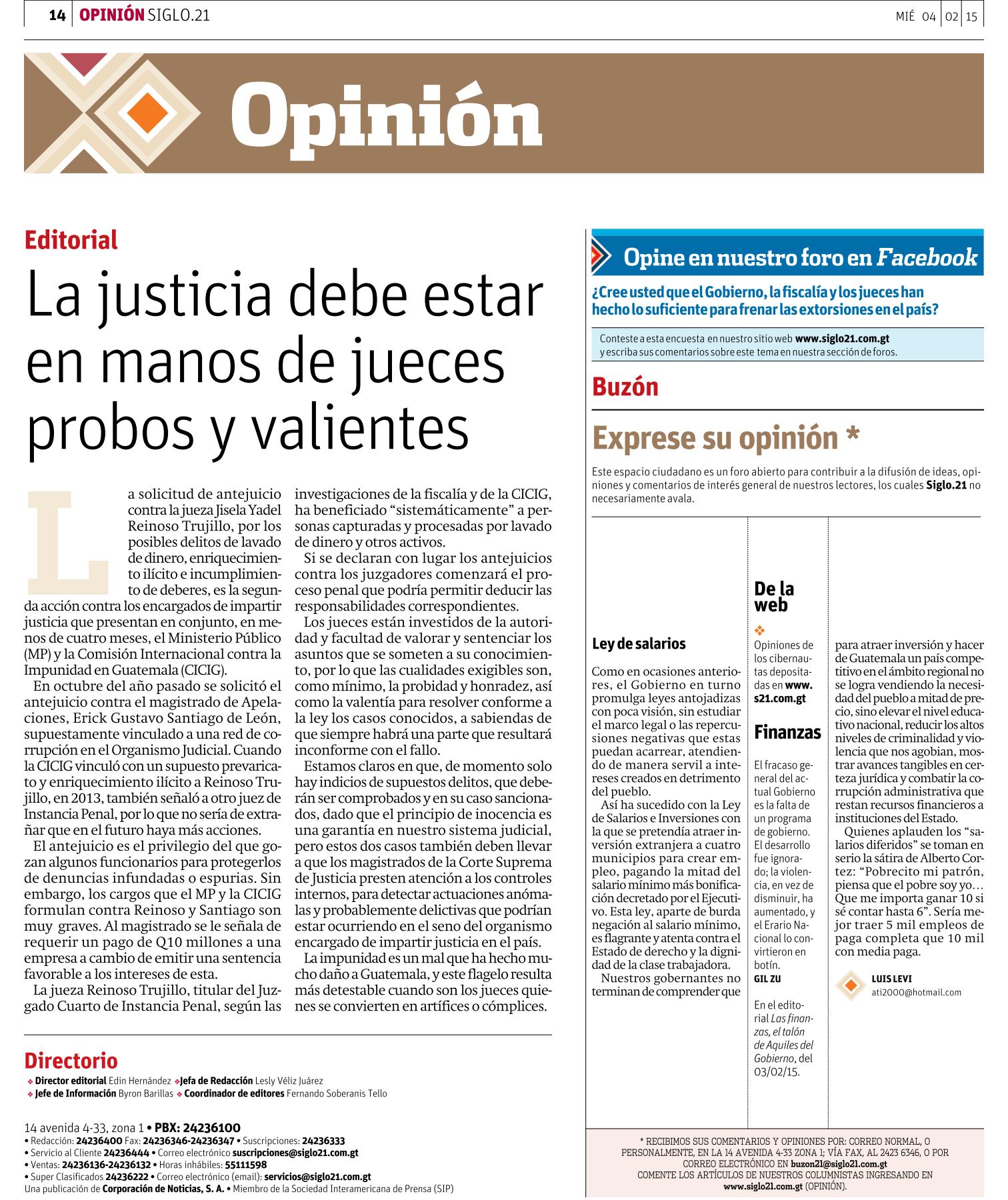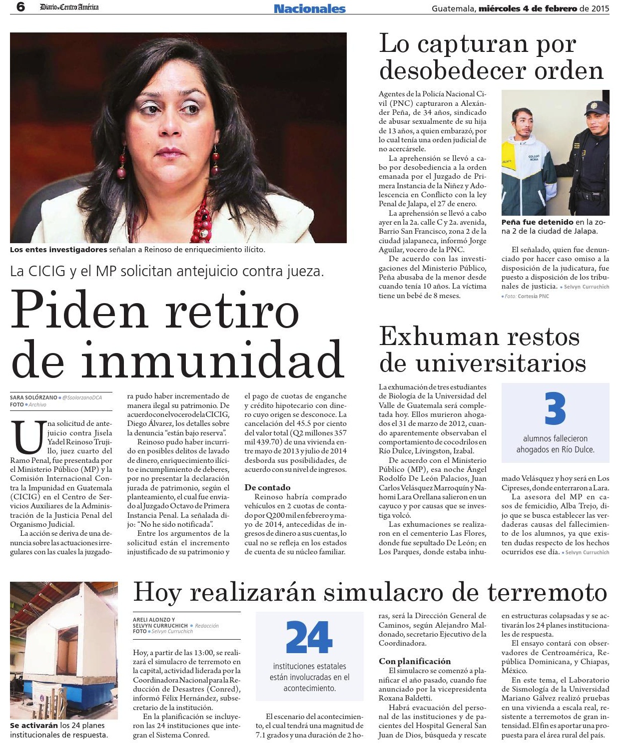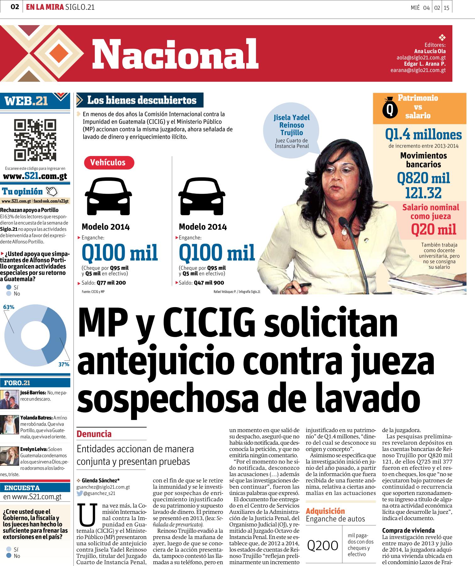 Guatemala, febrero 04 de 2015. Los medios de comunicación destacaron la noticia sobre la solicitud de antejuicio presentada por la CICIG y el Ministerio Público contra la jueza Jisela Yadel Reinoso Trujillo, con el fin de que se le investigue por el incremento injustificado de su patrimonio. (Se publica con fines informativos).