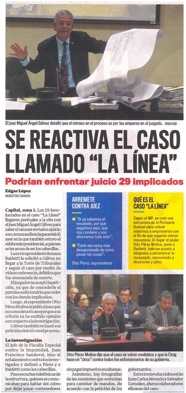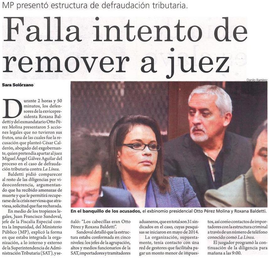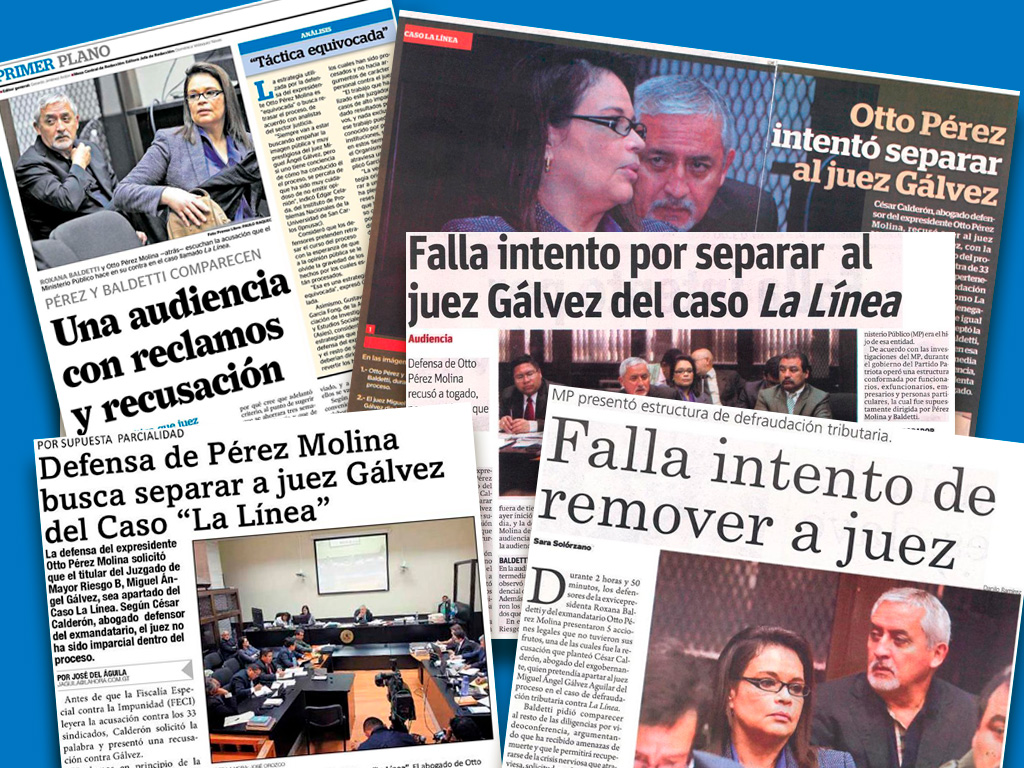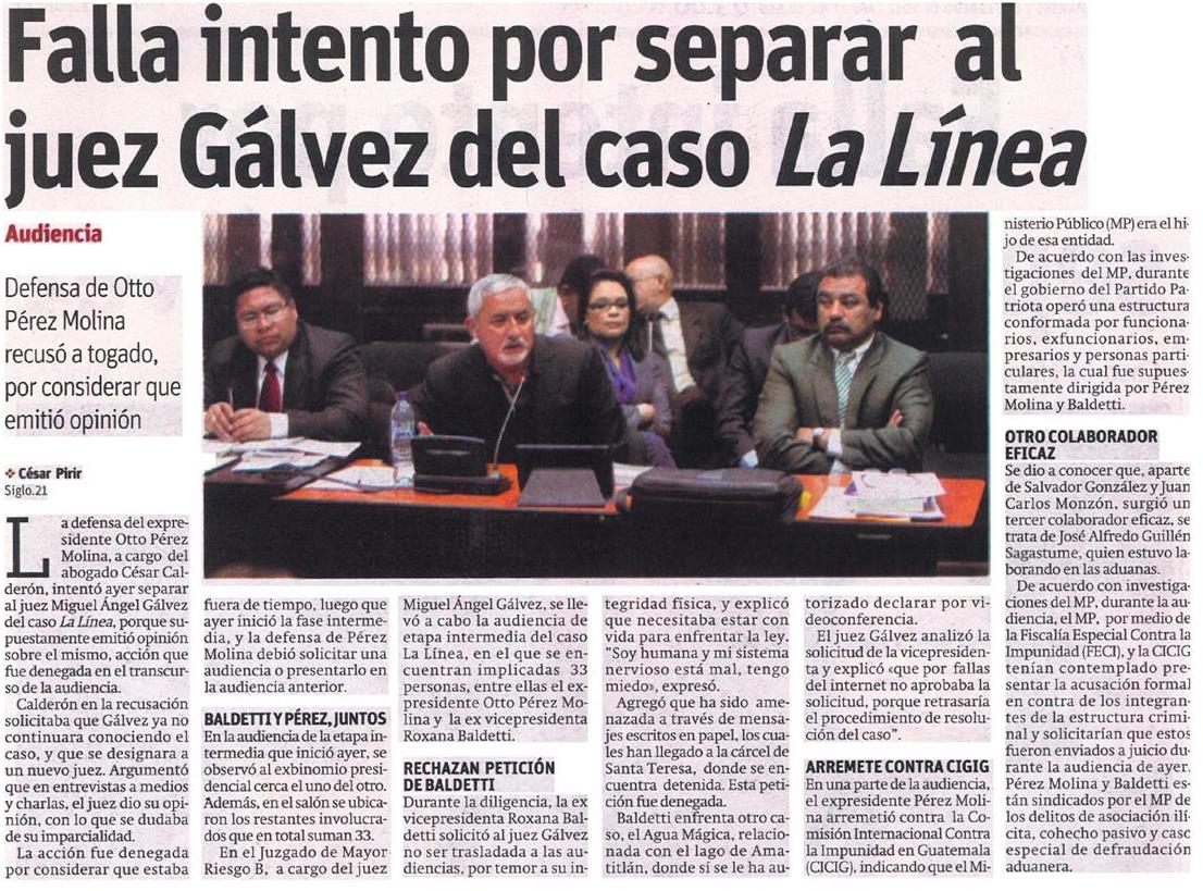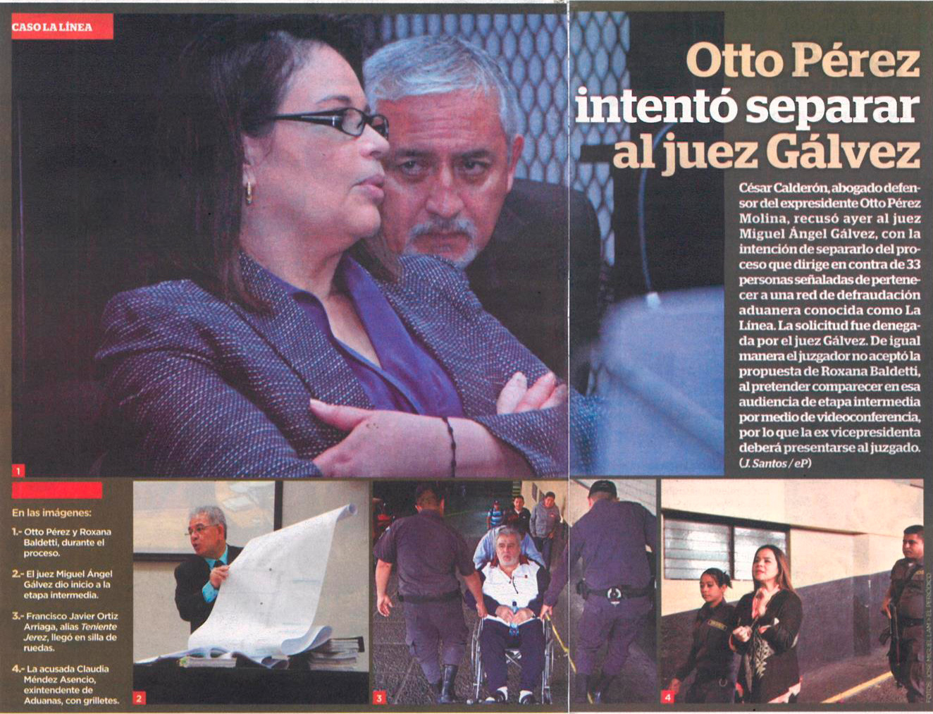 Guatemala, febrero 07 de 2017. Los medios de comunicación destacaron el fallido intento de la defensa del expresidente Otto Pérez Molina de separar al juez Miguel Ángel Gálvez del proceso en contra de varios sindicados en el caso "la línea". El abogado César Calderón planteó una recusación contra el juez Gálvez, quien declaró sin lugar dicha acción legal por carecer de fundamento. (Se publica con fines informativos).