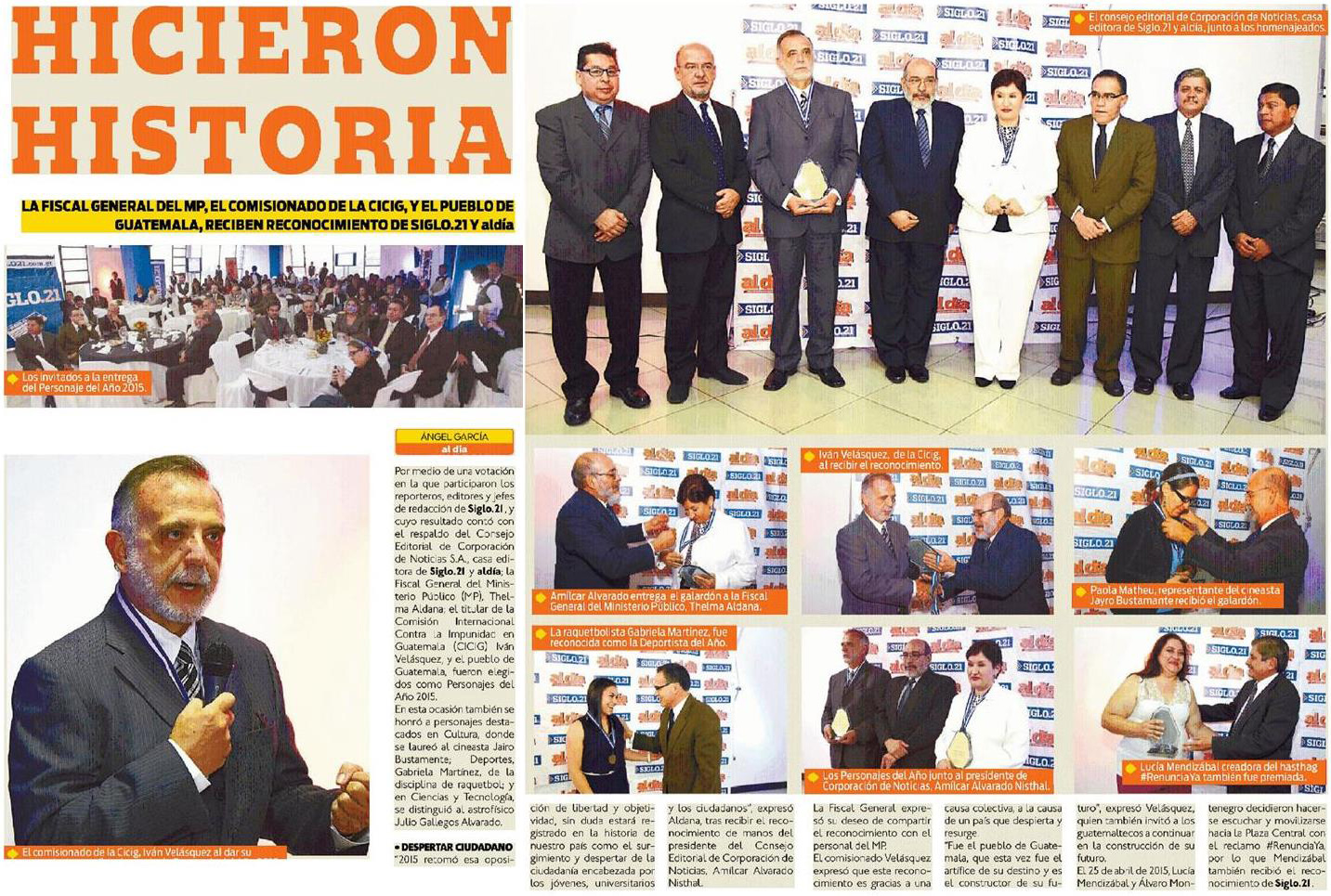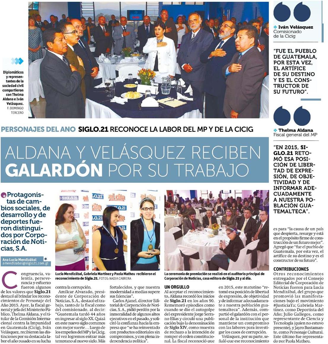 Guatemala, enero 22 de 2016. El matutino Siglo 21 entregó el reconocimiento de Personaje del Año 2015 al Comisionado Iván Velásquez Gómez y a la Fiscal General de la República, Thelma Aldana Hernández, por su destacada labor en la lucha contra la corrupción e impunidad. Ellos fueron seleccionados el pasado mes de diciembre por dicho periódico. (Se publica con fines informativos).