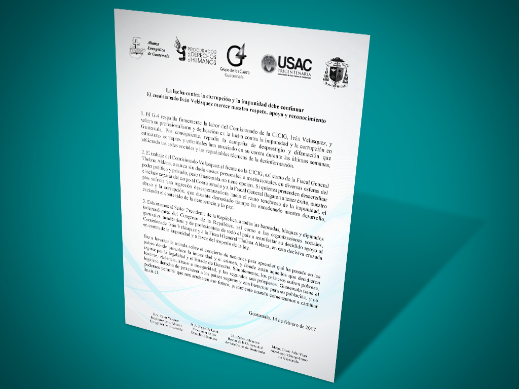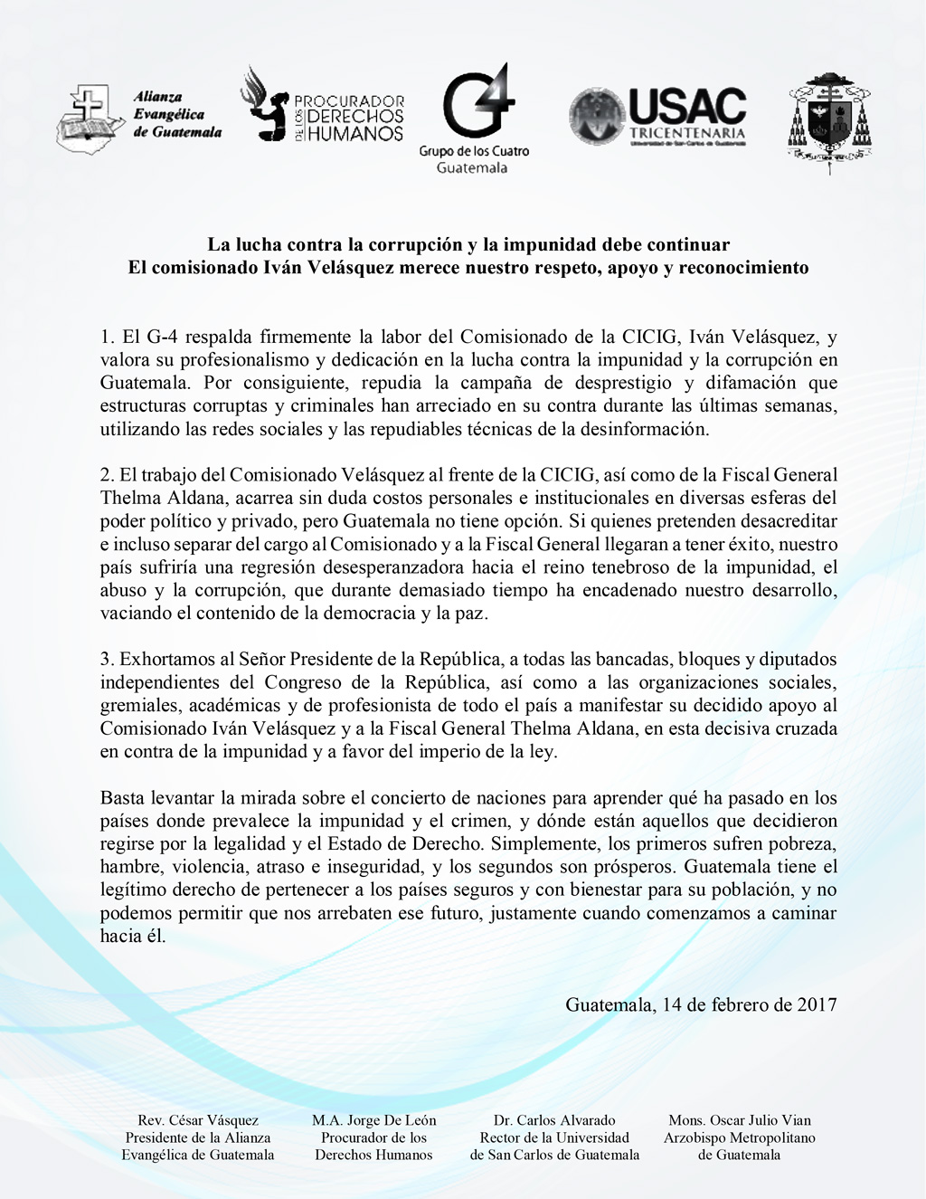Guatemala, febrero 14 de 2017. A través de un comunicado, el Grupo de los Cuatro (G4) declara públicamente su apoyo al trabajo del Comisionado Iván Velásquez, repudiando la campaña de desprestigio y difamación difundida en redes sociales y exhorta a distintos sectores a unirse al apoyo en la decisiva cruzada en contra de la impunidad. (Se publica con fines informativos).