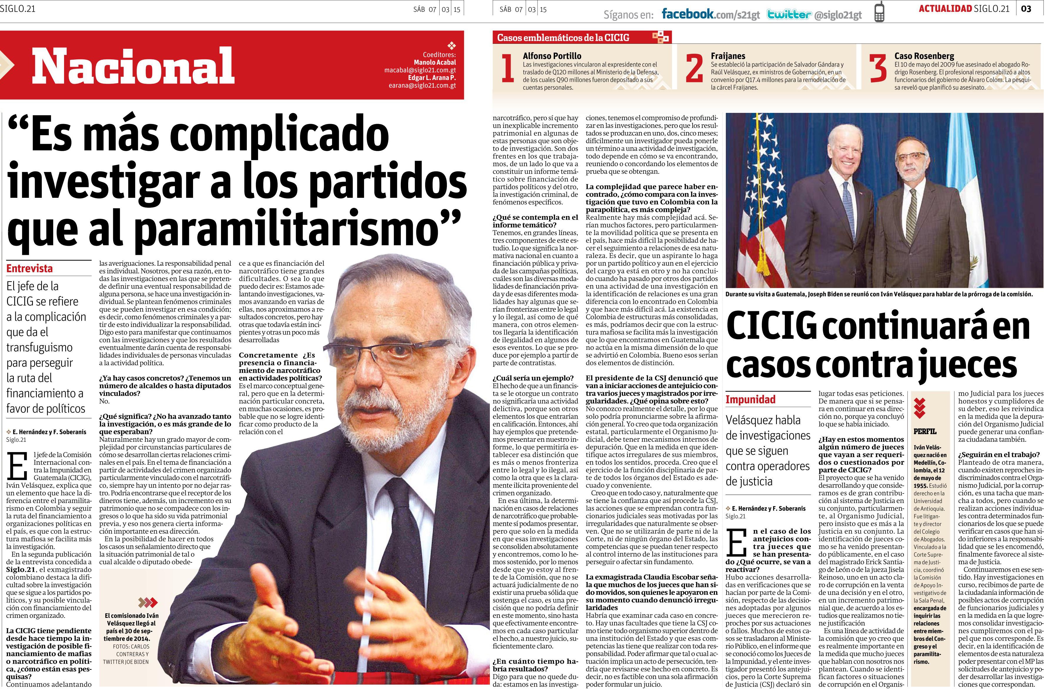 Guatemala, marzo 09 de 2015. El Comisionado Iván Velásquez Gómez fue entrevistado recientemente por el periódico Siglo 21,