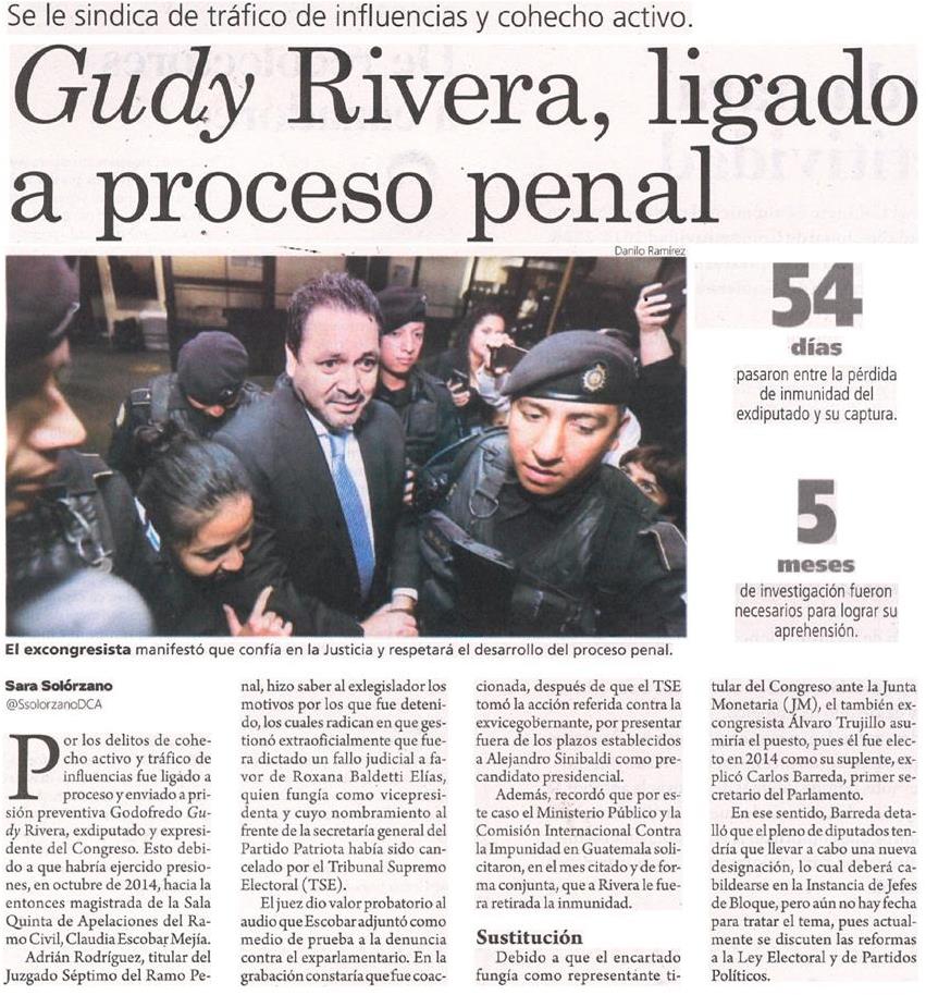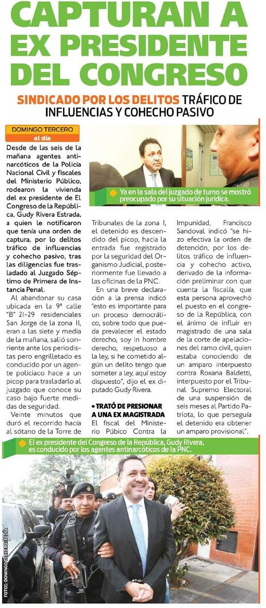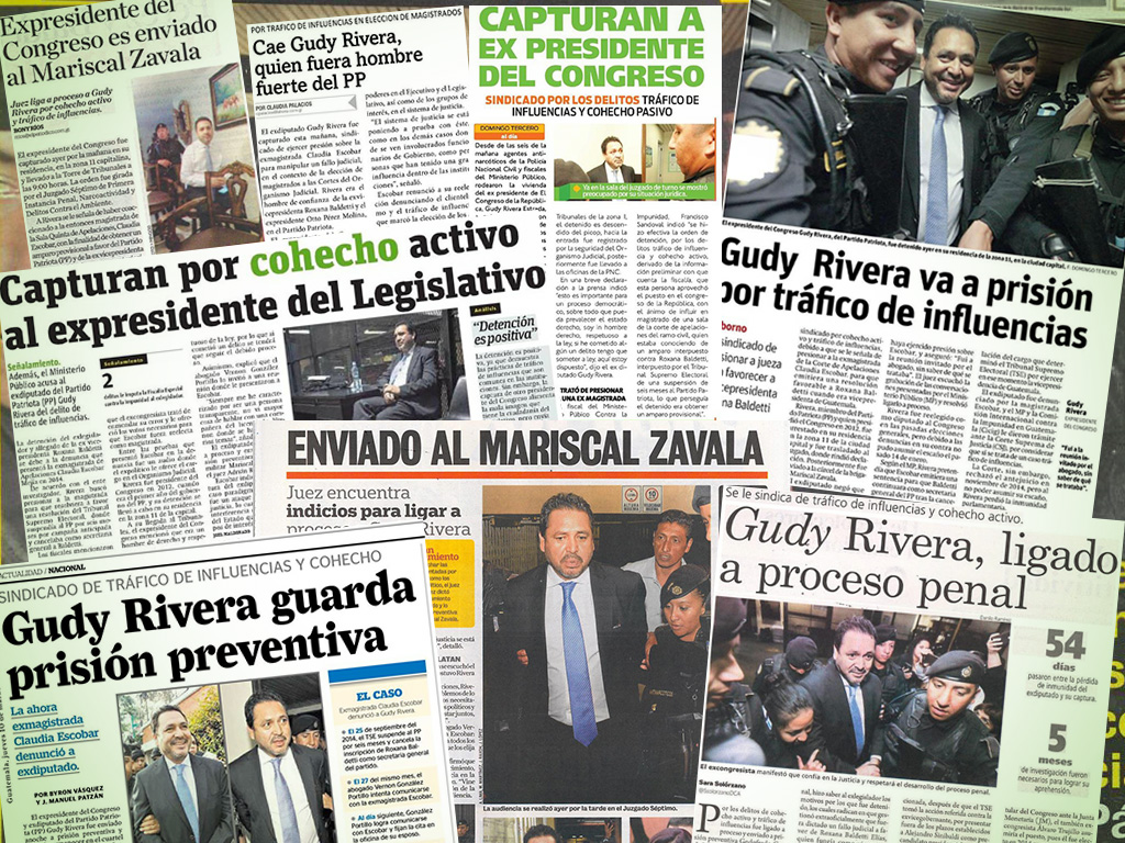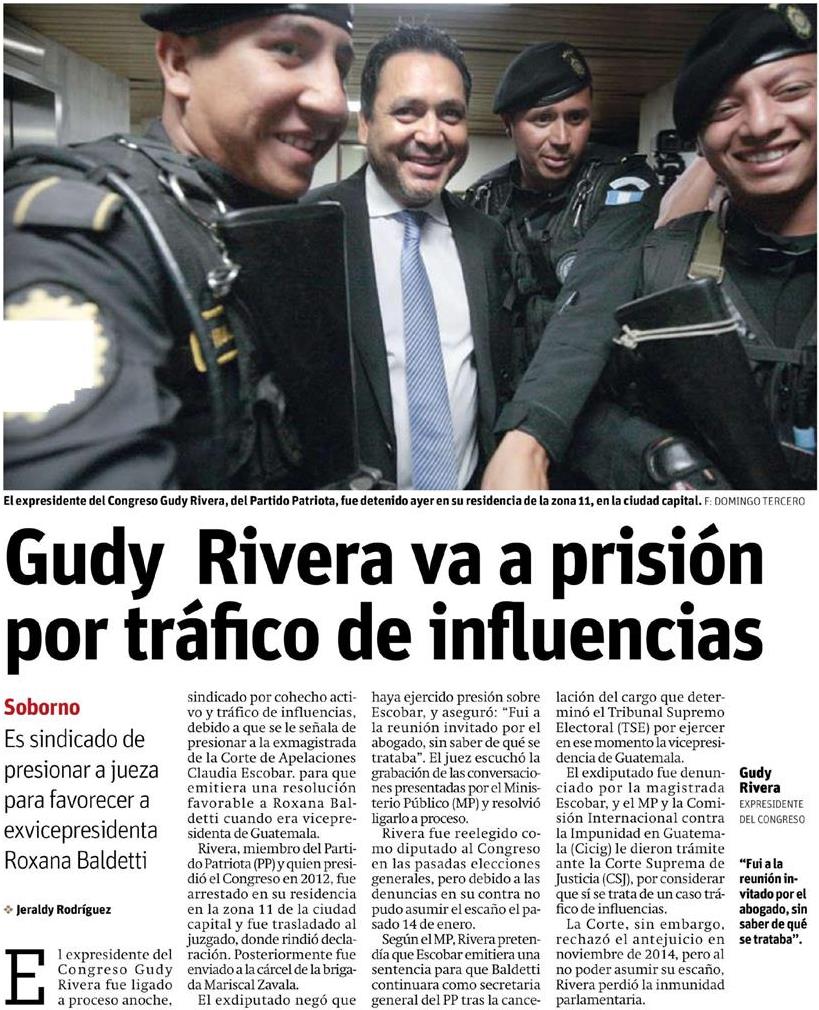 Guatemala, marzo 10 de 2016. Los medios de comunicación reportaron la resolución del Juzgado Séptimo de Instacia Penal, quien ligó a proceso y envió a prisión preventiva al expresidente del Congreso, Gudy Rivera, por los delitos de tráfico de influencias y cohecho activo. (Se publica con fines informativos).