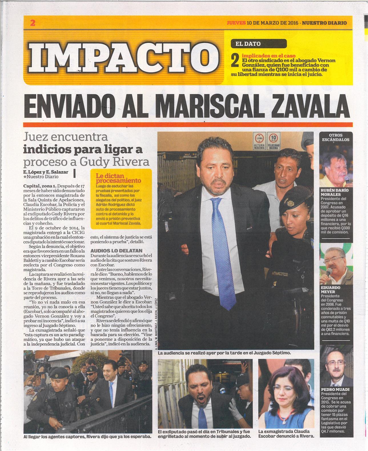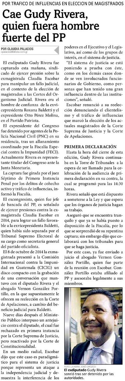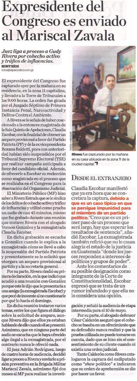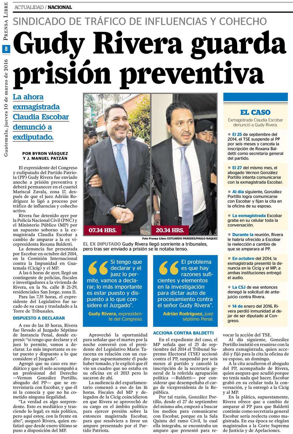 Guatemala, marzo 10 de 2016. Los medios de comunicación reportaron la resolución del Juzgado Séptimo de Instacia Penal, quien ligó a proceso y envió a prisión preventiva al expresidente del Congreso, Gudy Rivera, por los delitos de tráfico de influencias y cohecho activo. (Se publica con fines informativos).