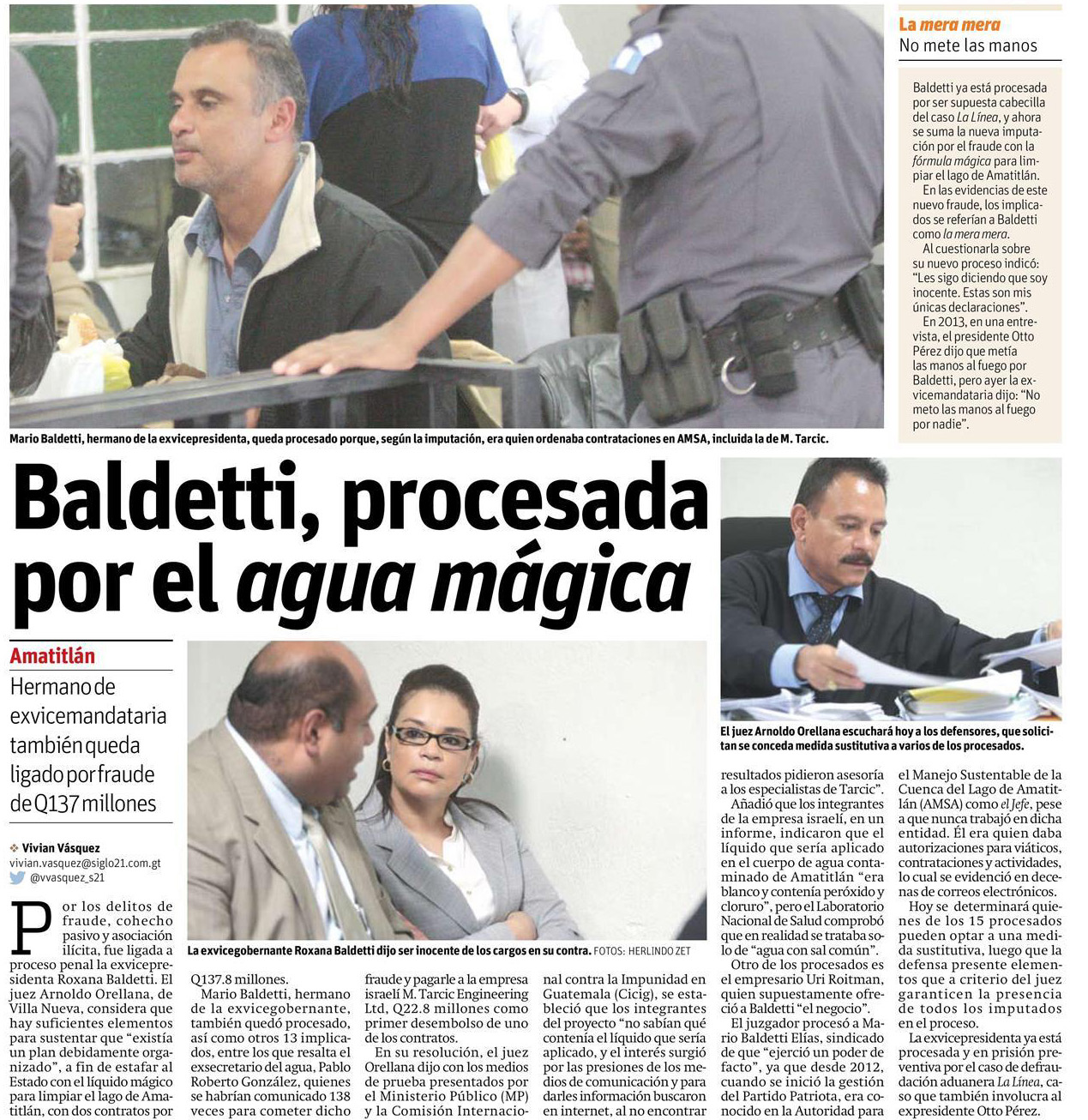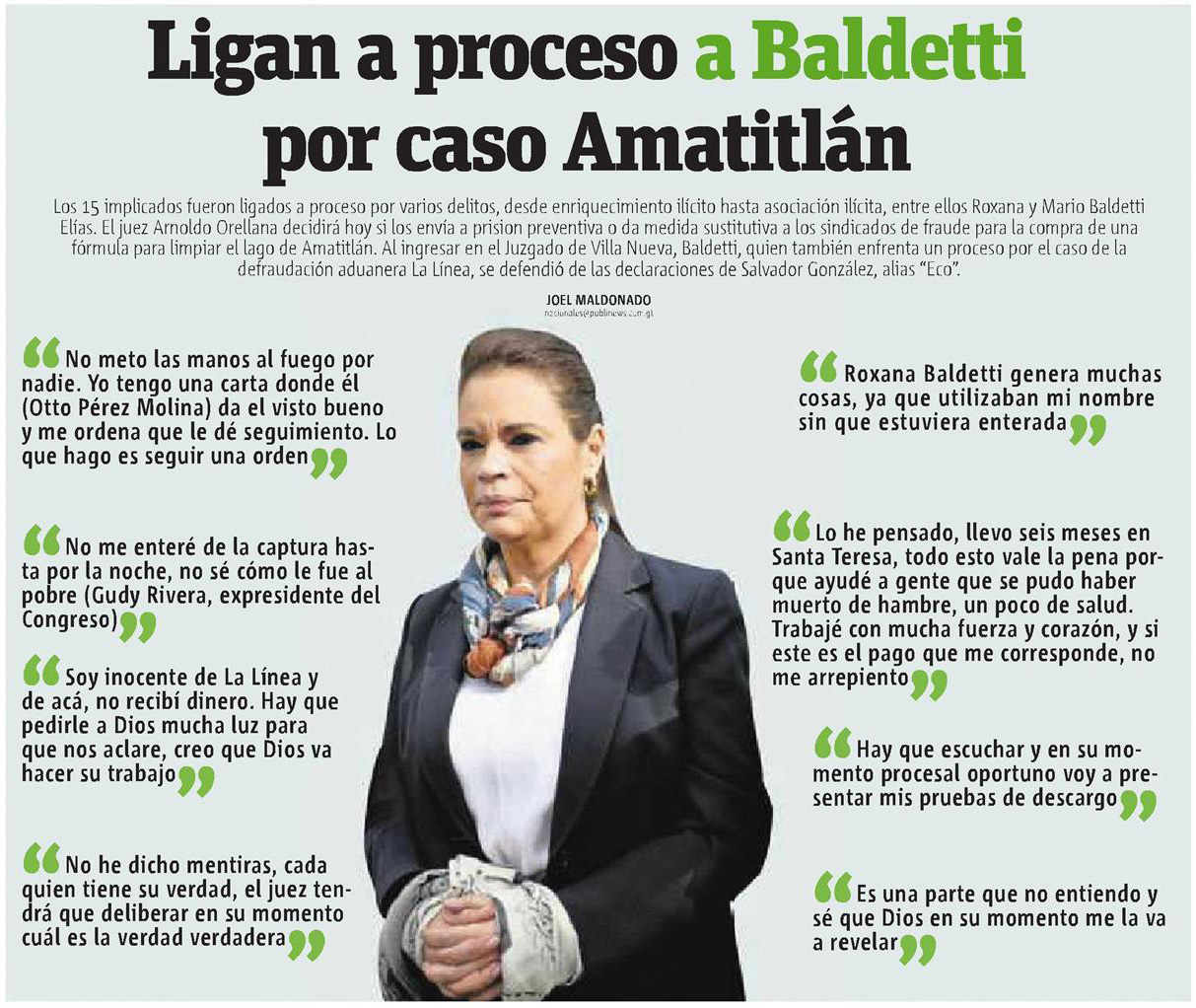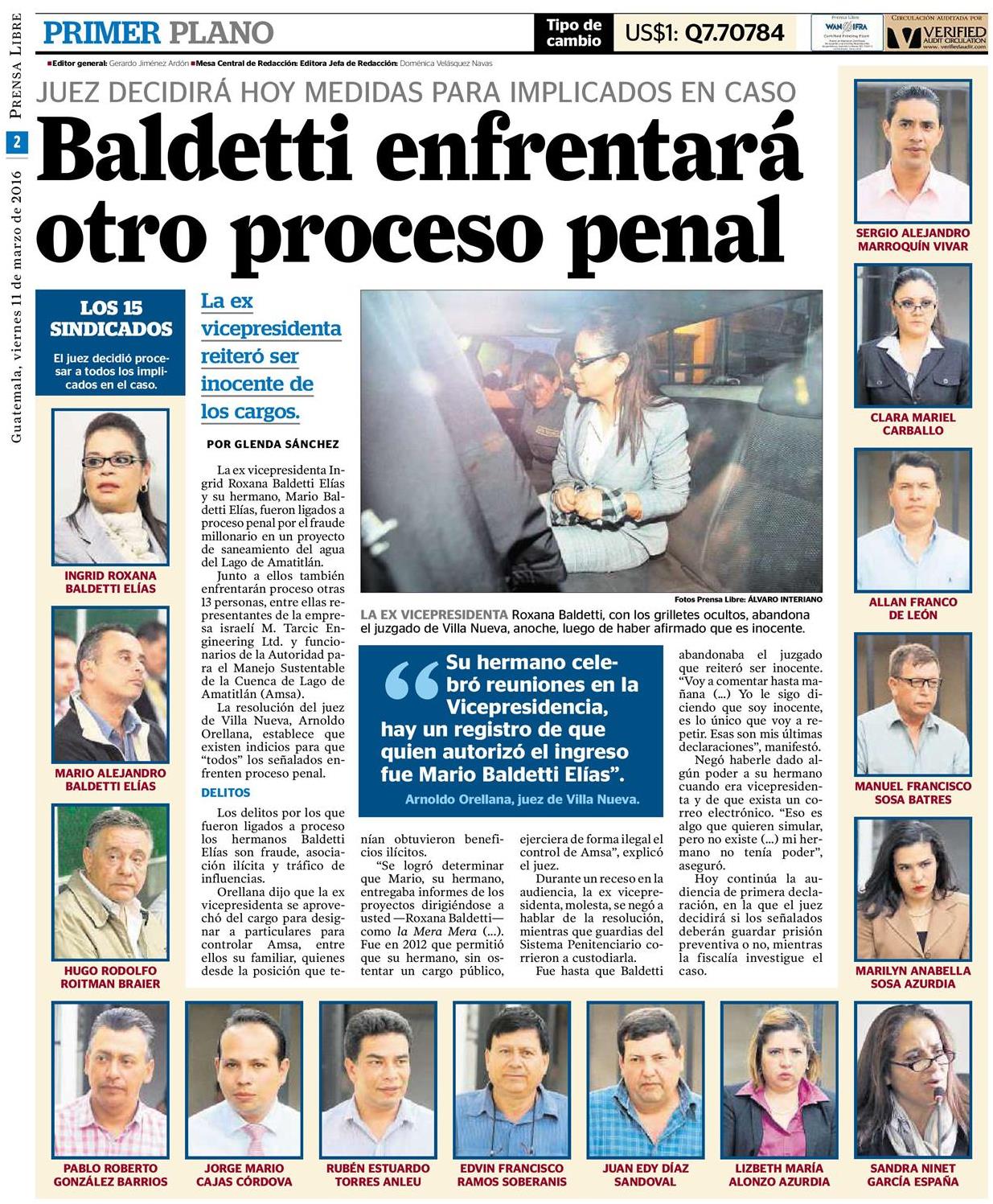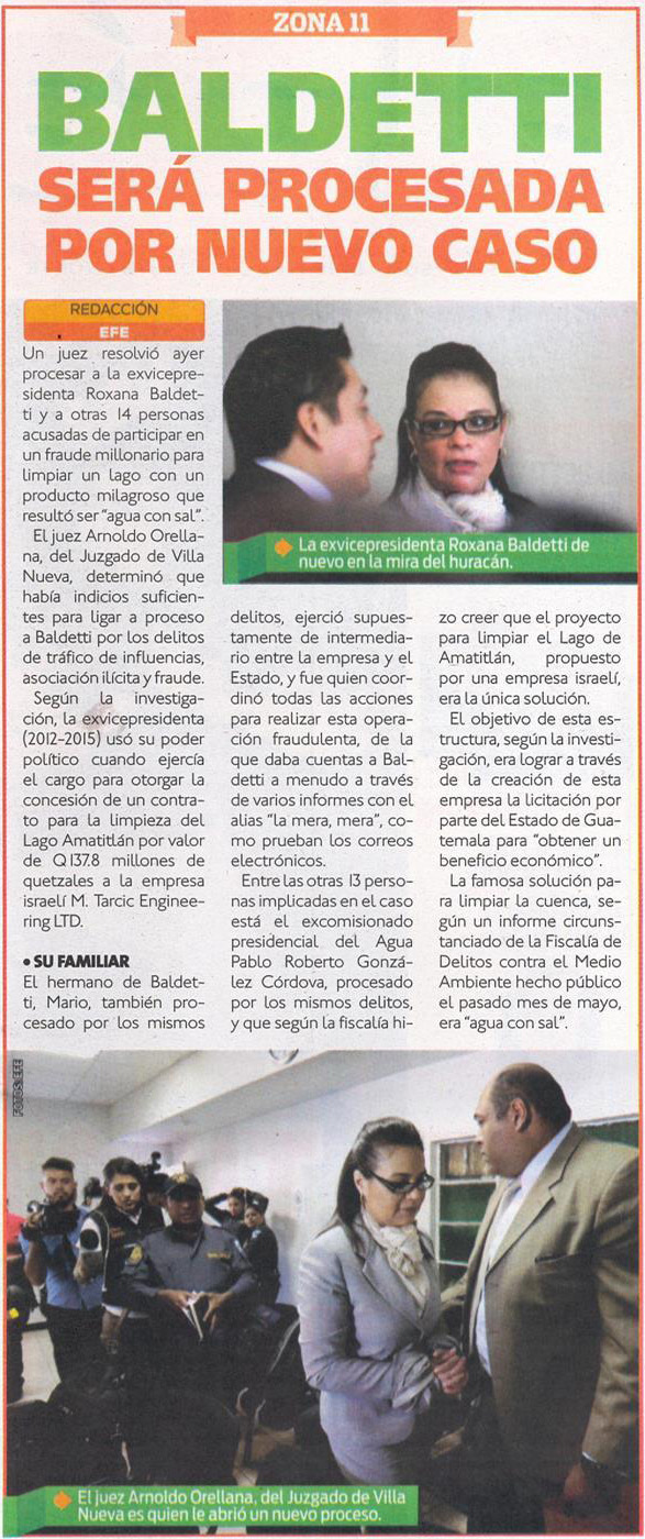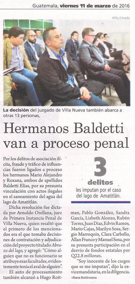Guatemala, marzo 11 de 2016. Los medios de comunicación destacaron la resolución del juez de Primera Instancia Penal de Villa Nueva, Arnoldo Orellana, quien ligó a proceso a 15 sindicados en el caso del Lago de Amatitlán, entre ellos se encuentra la exvicepresidenta Ingrid Roxana Baldetti Elias y su hermano Mario Alejandro Baldetti. (Se publica con fines informativos).