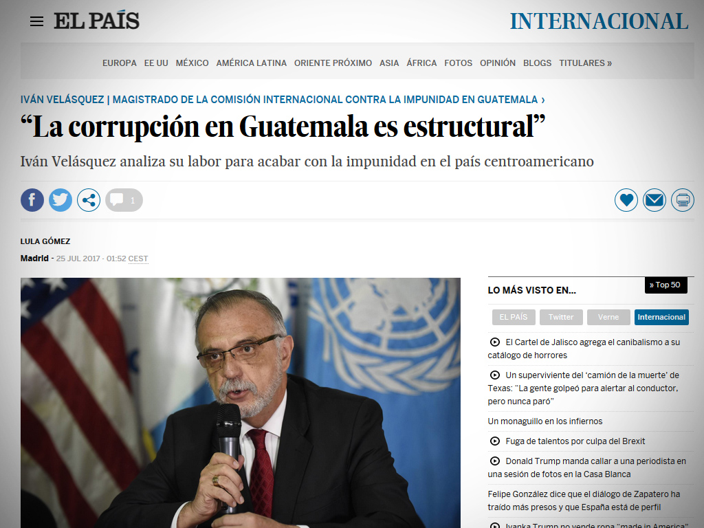 Guatemala, julio 25 de 2017. La periodista Lula Gómez del diario internacional El País entrevistó al Comisionado Iván Velásquez Gómez para analizar la labor de la Comisión en su lucha contra la impunidad en Guatemala. El Comisionado resaltó, entre otros temas, la participación ciudadana como una garantía para luchar contra la impunidad y la corrupción, así como la necesidad de promover una cultura de legalidad y la modernización del sistema de justicia. (Se publica con fines informativos).