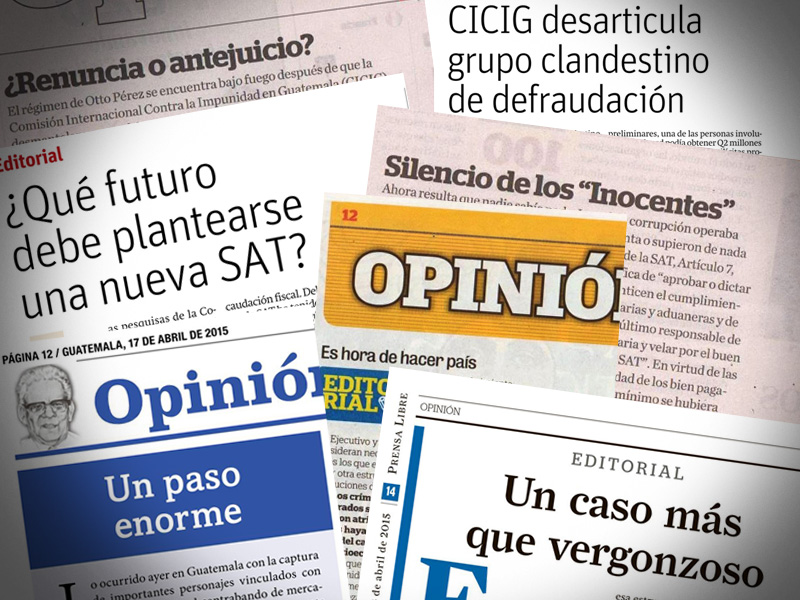 Guatemala, abril 20 de 2015. Varios medios de comunicación destacaron en sus editoriales el descubrimiento de la estructura que operaba en la Superintendencia de Administración Tributaria (SAT) y calificaron de positiva la investigación de la CICIG y el MP. (Se publica con fines informativos).