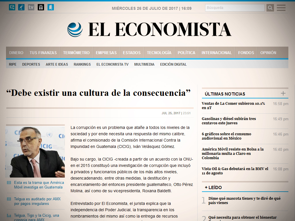 Guatemala, julio 26 de 2017. El periodista Héctor Molina del diario mexicano El Economista conversó con el Comisionado Iván Velásquez Gómez, quien enfatizó que debe existir una cultura de la consecuencia para combatir la corrupción, así como una independencia judicial y el fortalecimiento de las instituciones de justicia, entre otros aspectos.