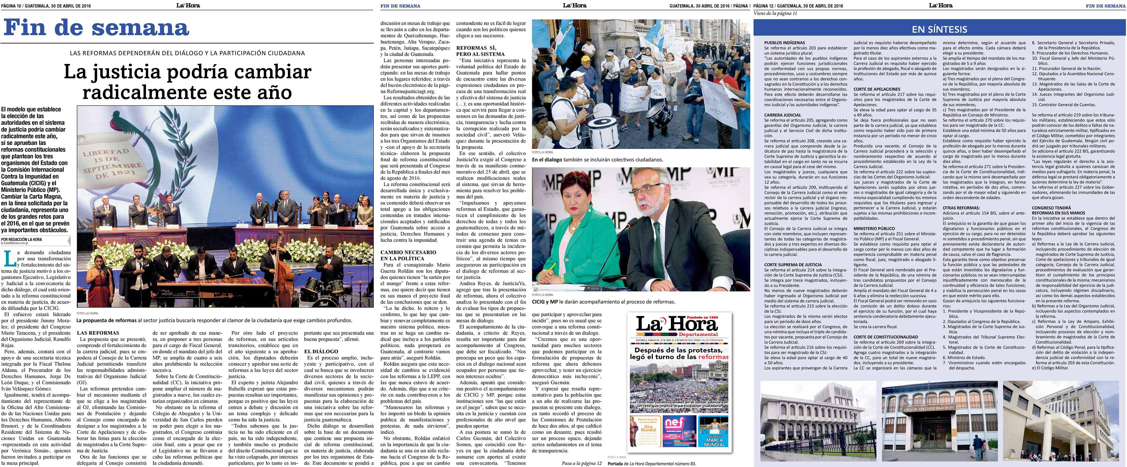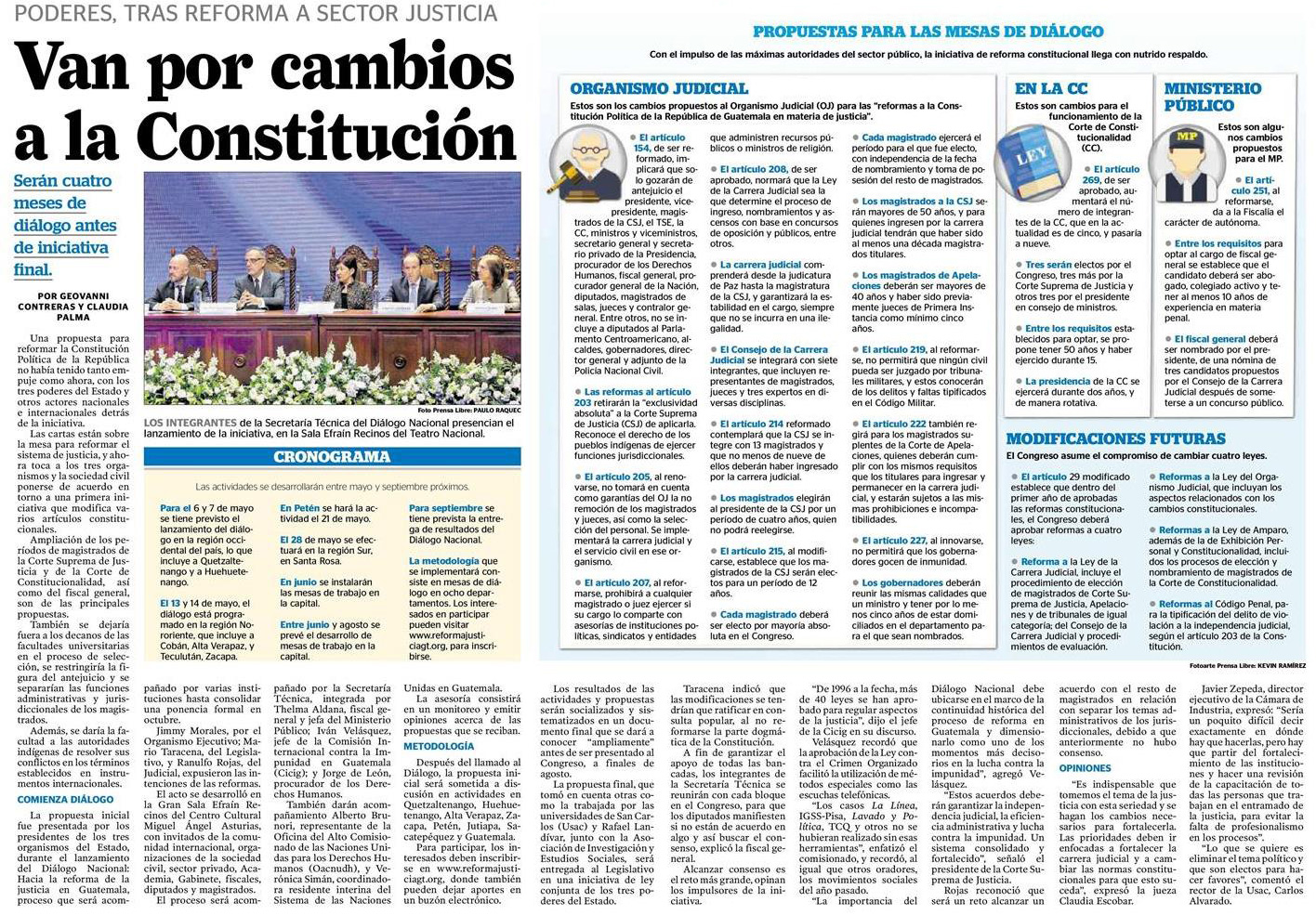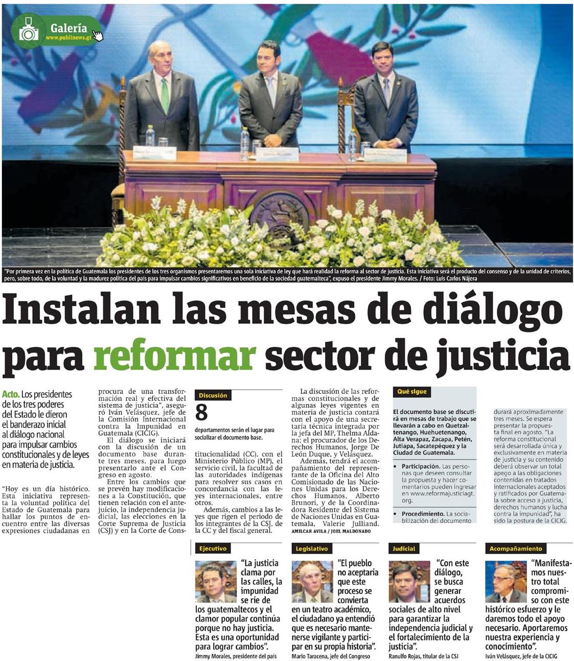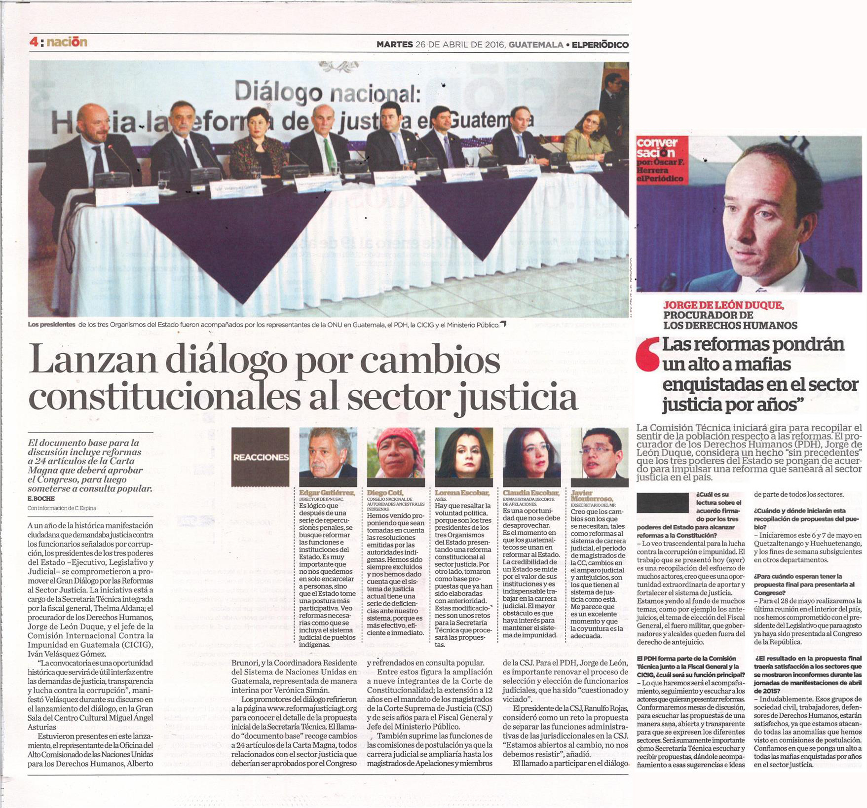 Guatemala, abril 26 de 2016. Los medios de comunicación resaltaron la convocatoria de parte de los organismos Ejecutivo, Legislativo y Judicial para que diversos sectores del país participen en el Diálogo nacional: Hacia la Reforma de la Justicia, cuyo objetivo es promover la discusión, aprobación e implementación de reformas