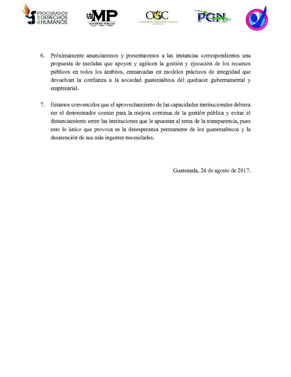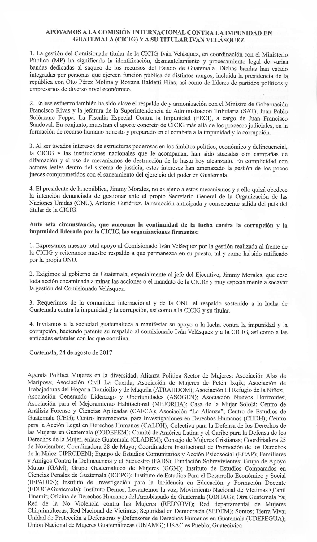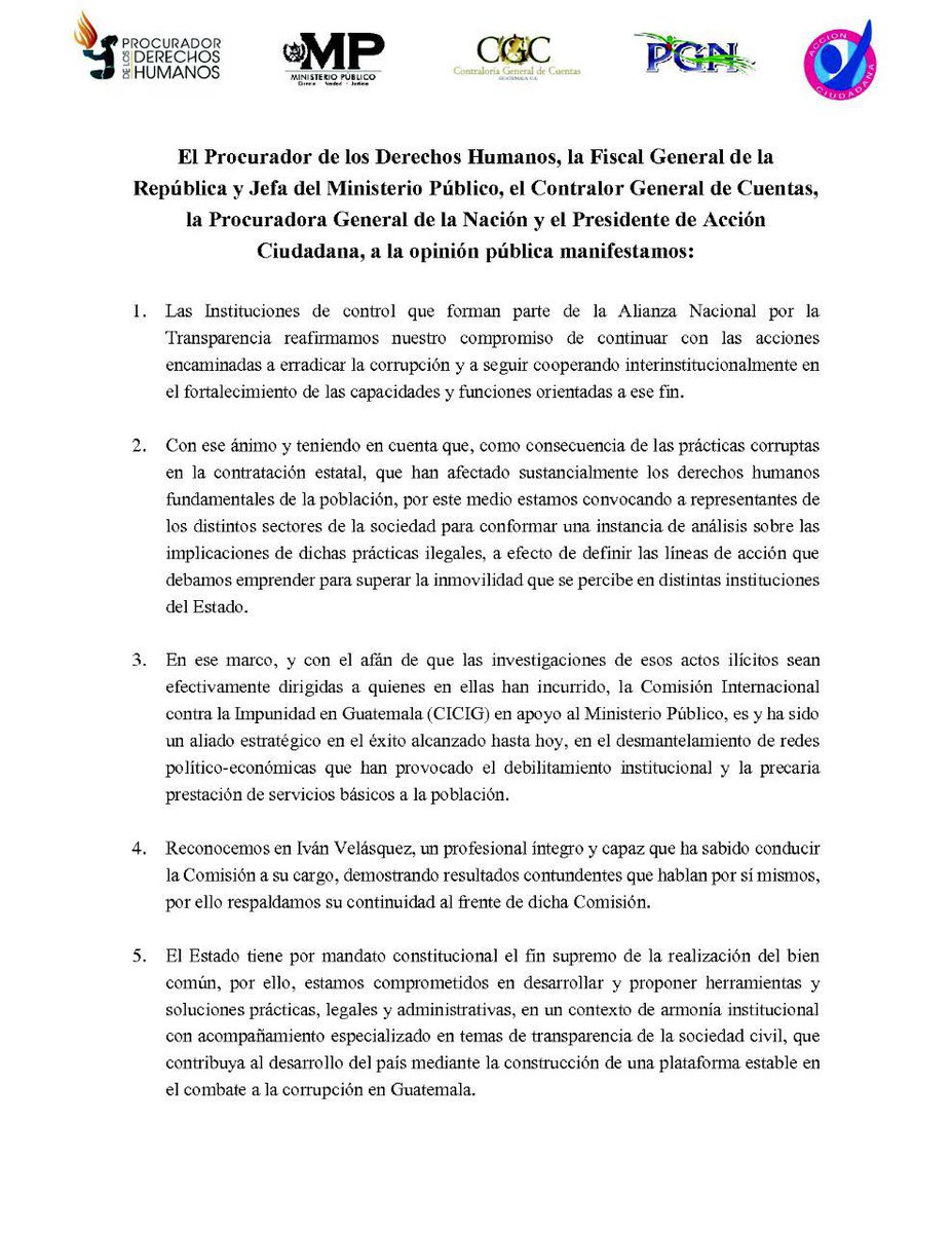 “(…) La Comisión Internacional contra la Impunidad en Guatemala, en apoyo al MP, ha sido un aliado estratégico en el éxito alcanzado hasta hoy, en el desmantelamiento de redes político-económicas que han provocado el debilitamiento institucional y la precaria prestación de servicios básicos de la población”, aseveraron los representantes de la Alianza Nacional por la Transparencia.