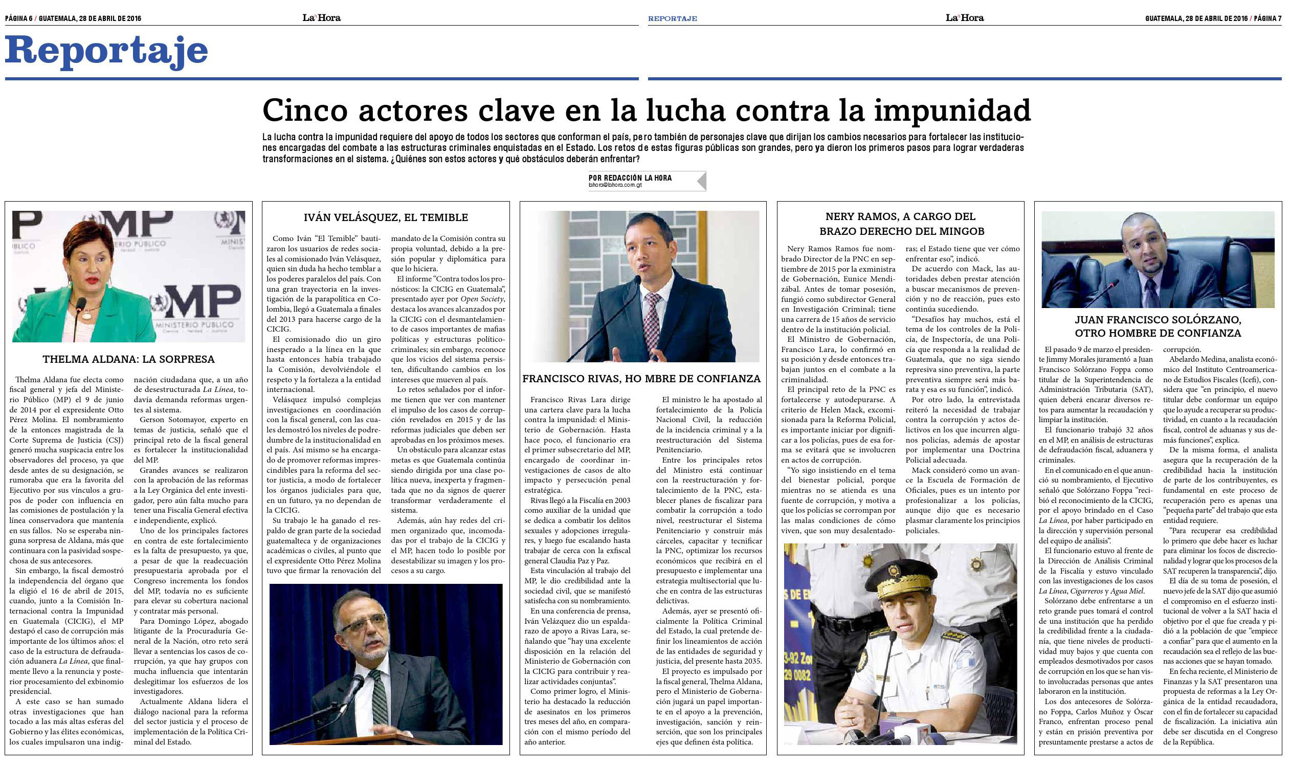 Guatemala, abril 29 de 2016. El verspertino La Hora publicó un reportaje sobre los cinco actores clave en la lucha contra las estructuras criminales enquistadas en el Estado. Ellos son: El Comisionado Iván Velásquez Gómez; la Fiscal General, Thelma Aldana Hernández; el ministro de Gobernación, Francisco Rivas Lara; el director de la PNC, Nery Ramos, Ramos; y el jefe de la Superintendencia de Administración Tributaria (SAT), Juan Francisco Solórzano Foppa. (Se publica con fines informativos).