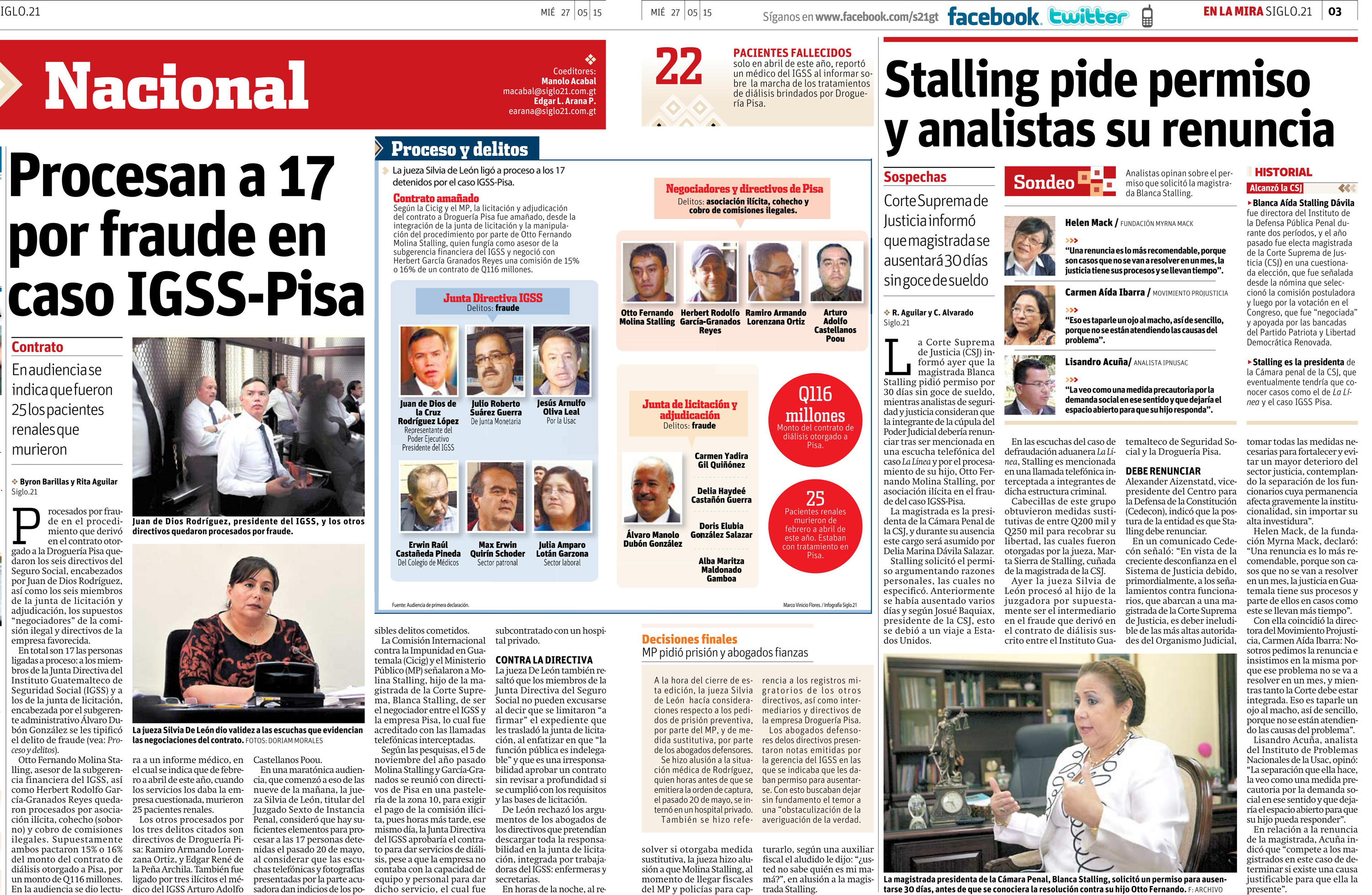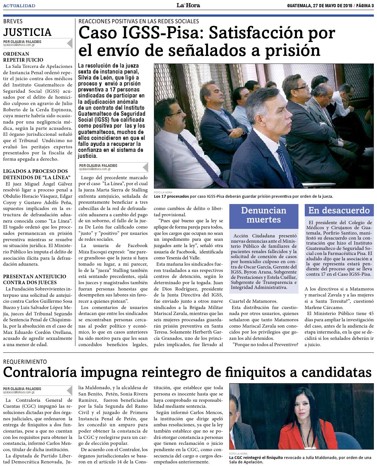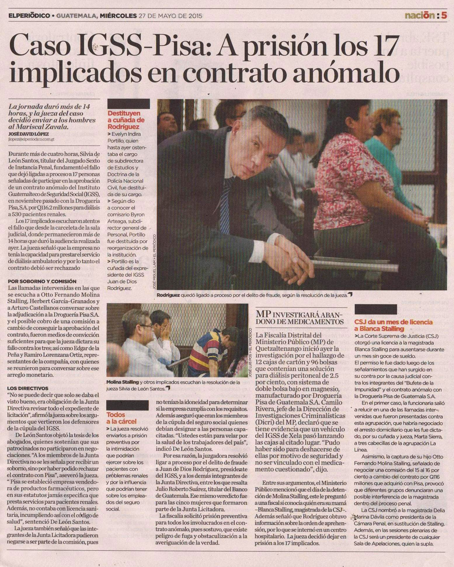 Guatemala, mayo 27 de 2015. Los medios de comunicación resaltaron la noticia del fallo de la jueza Sexta de Instancia Penal, Silvia de León, quien resolvió ligar a proceso y enviar a prisión preventiva a los 17 sindicados del caso IGSS. El próximo 13 de julio el Ministerio Público deberá presentar la acusación formal y el 27 del mismo mes se decidirá en audiencia si van o no a juicio. (Se publica con fines informativos).