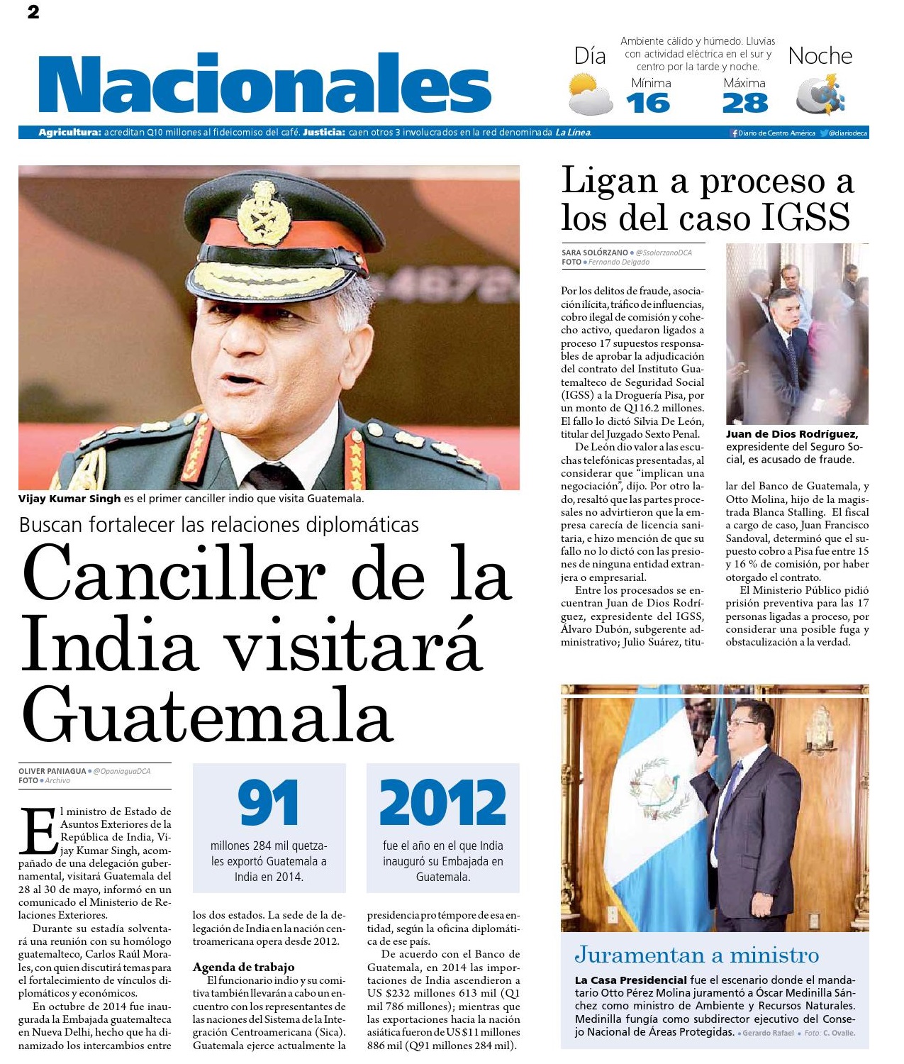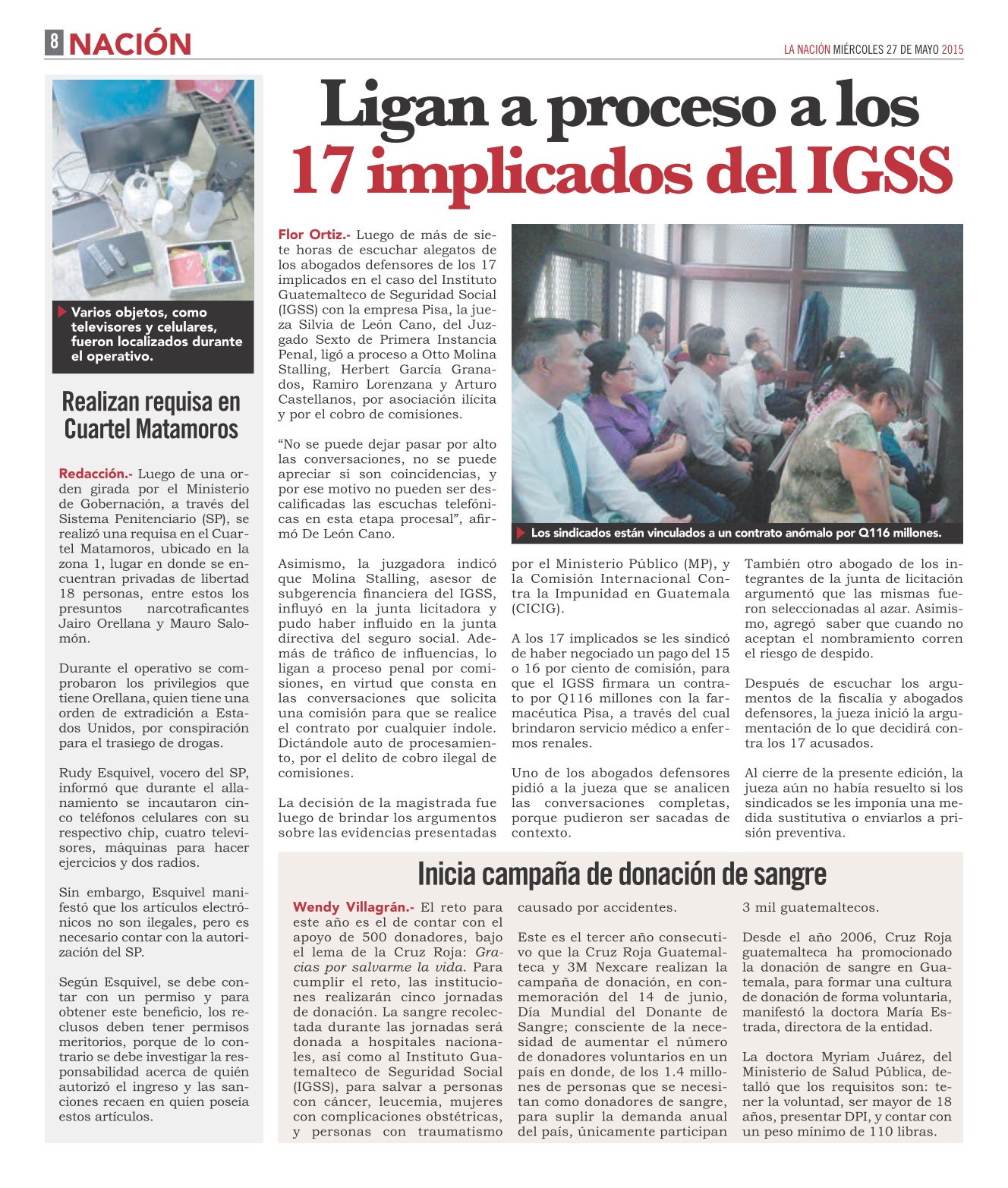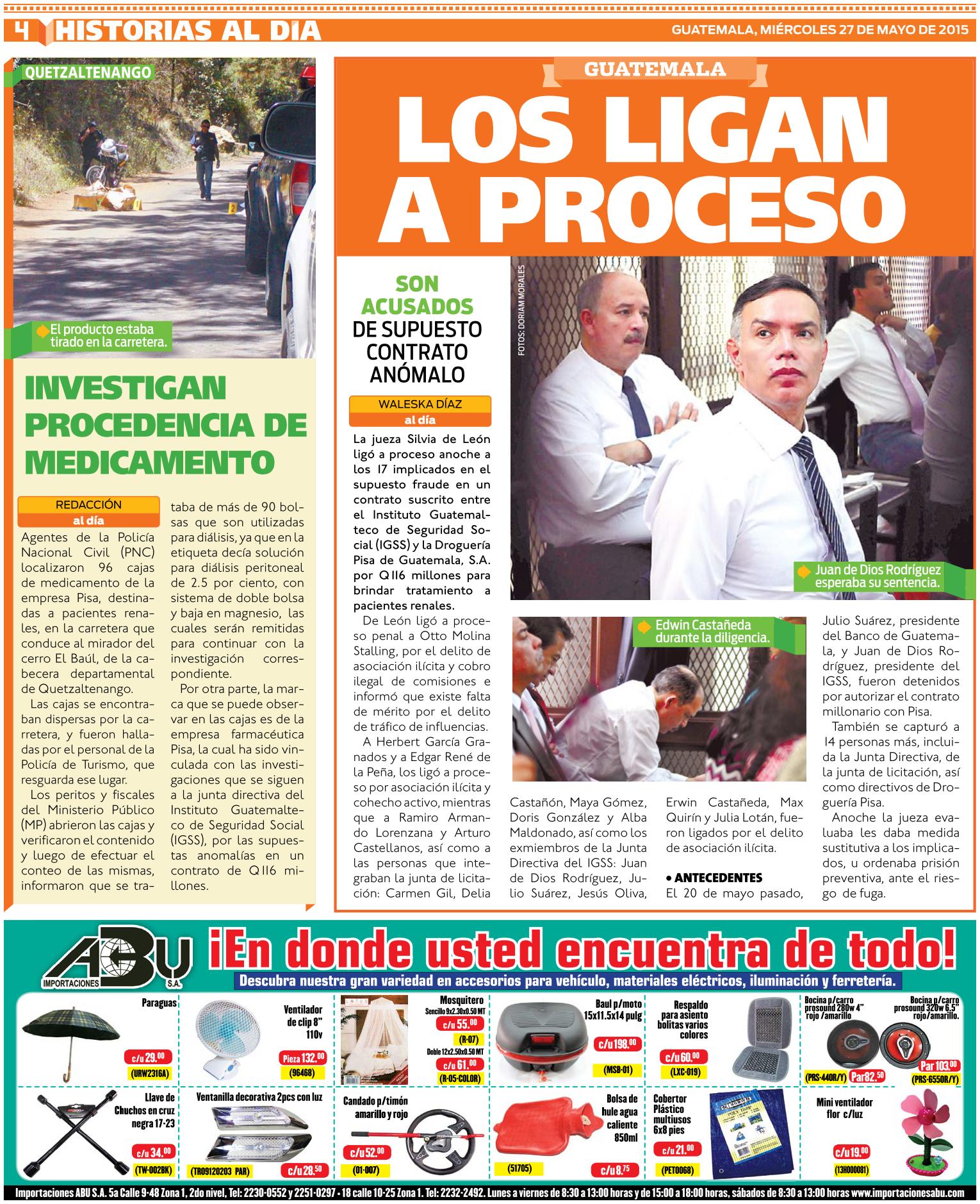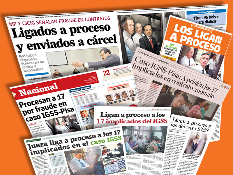 Guatemala, mayo 27 de 2015. Los medios de comunicación resaltaron la noticia del fallo de la jueza Sexta de Instancia Penal, Silvia de León, quien resolvió ligar a proceso y enviar a prisión preventiva a los 17 sindicados del caso IGSS. El próximo 13 de julio el Ministerio Público deberá presentar la acusación formal y el 27 del mismo mes se decidirá en audiencia si van o no a juicio. (Se publica con fines informativos).