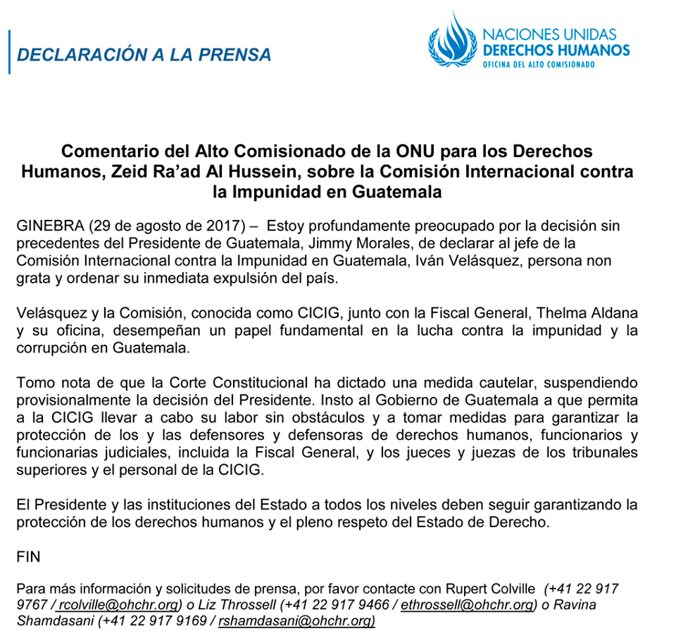 Guatemala, agosto 29 de 2017. El Alto Comisionado de la ONU para los Derechos Humanos, Zeid Raád Al Hussein, comentó estar profundamente preocupado por la decisión sin precedentes del Presidente Jimmy Morales, de declarar al jefe de la Comisión Internacional contra la Impuidad en Guatemala, Iván Velásquez, persona non grata y ordenar su inmediata expulsión del país.