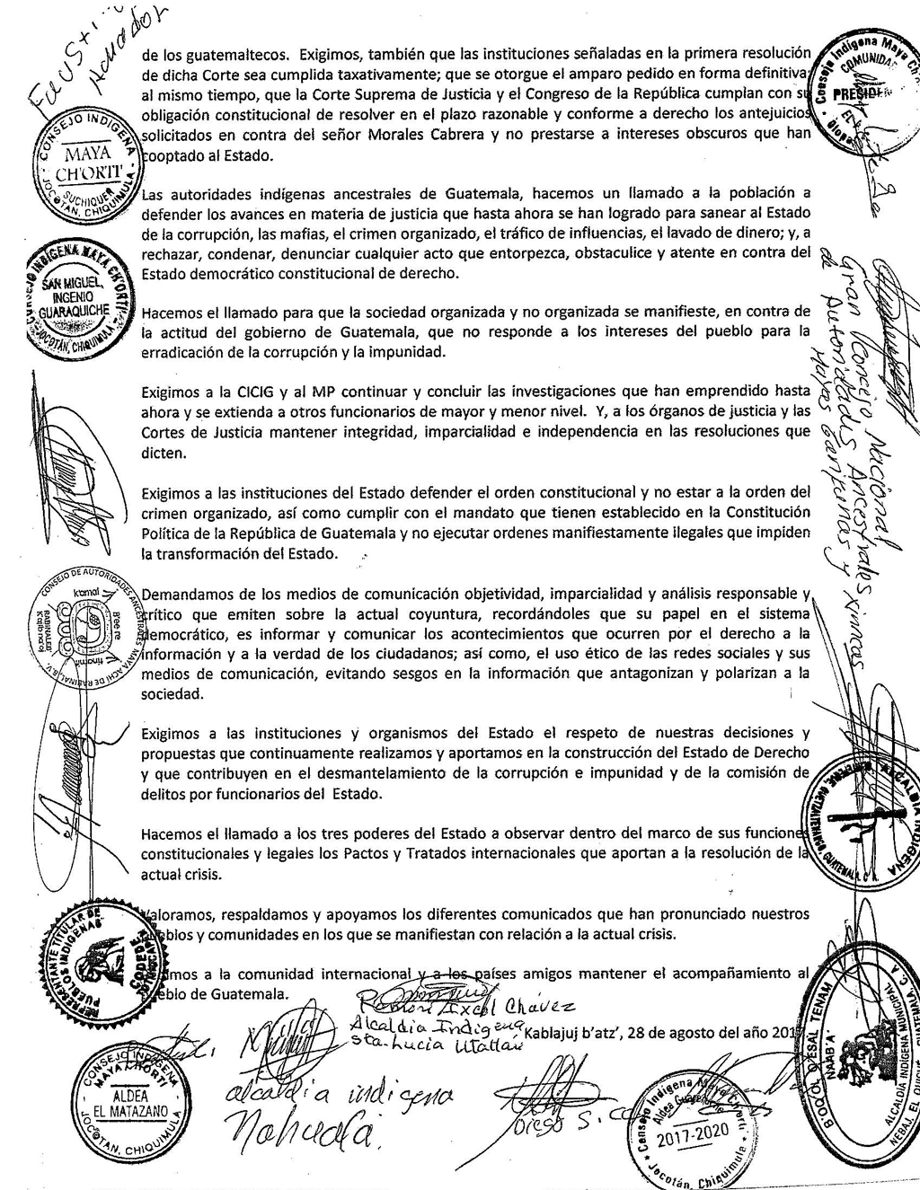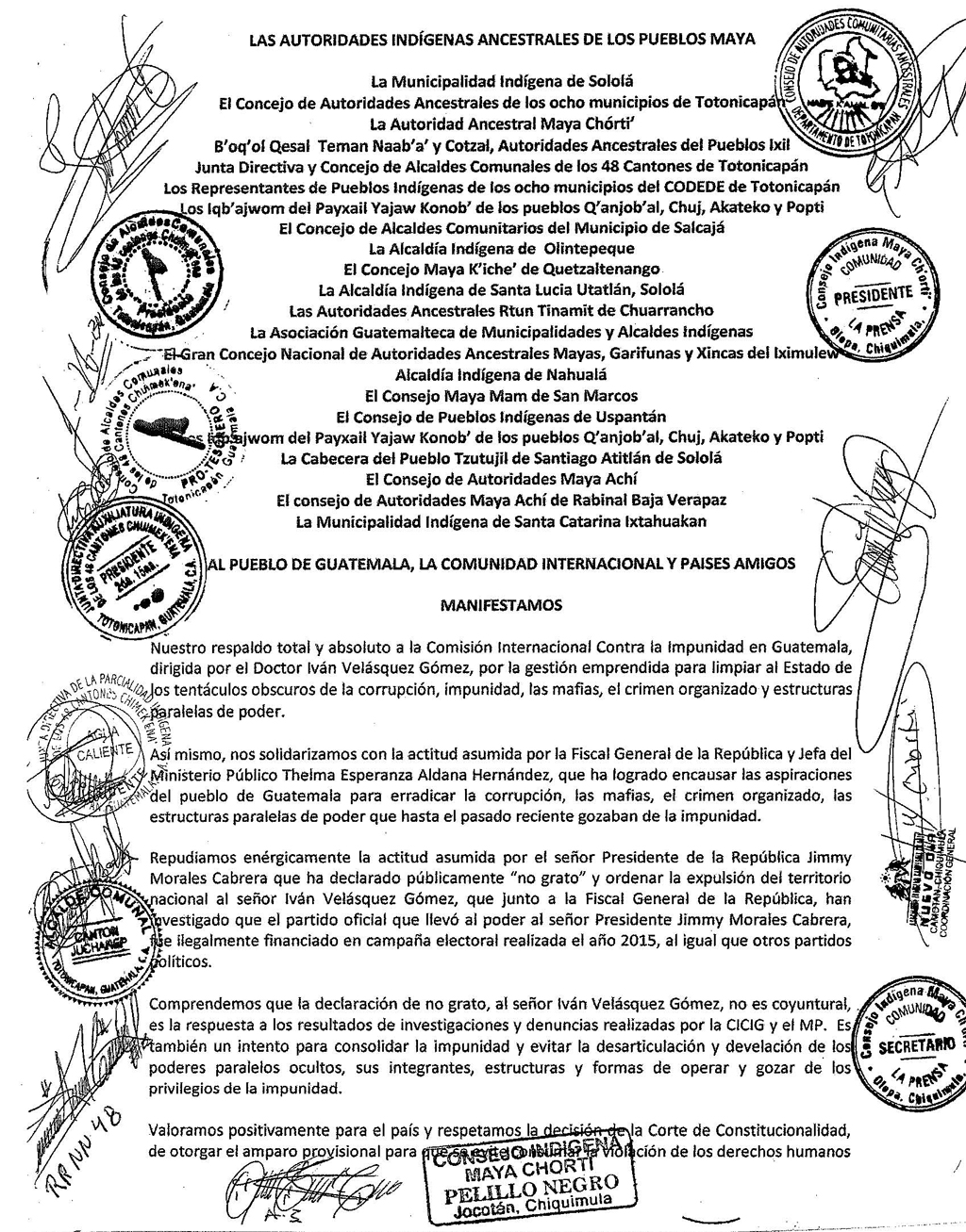 Guatemala, agosto 29 de 2017. Las autoridades indígenas ancestrales de los pueblos mayas manifestaron su respaldo total y absoluto a la Comisión Internacional contra la Impunidad en Guatemala, dirigida por el Comisionado Iván Velásquez Gómez, por la gestión emprendida para combatir los tentáculos obscuros de la corrupción, impunidad y estructuras paralelas de poder.