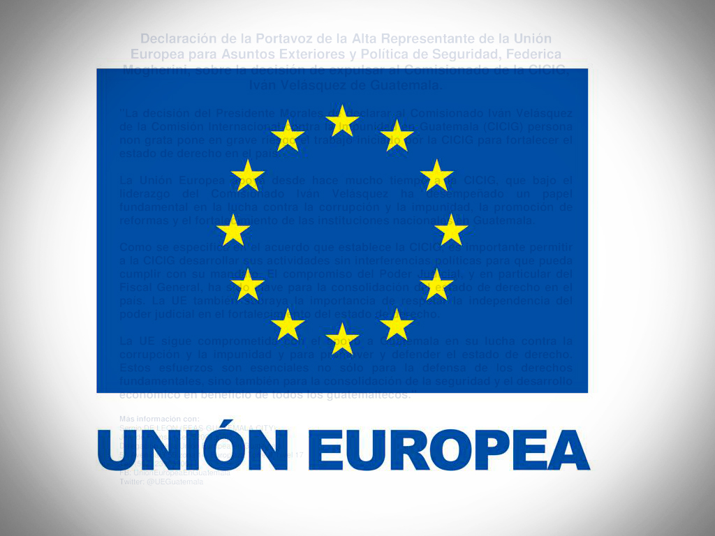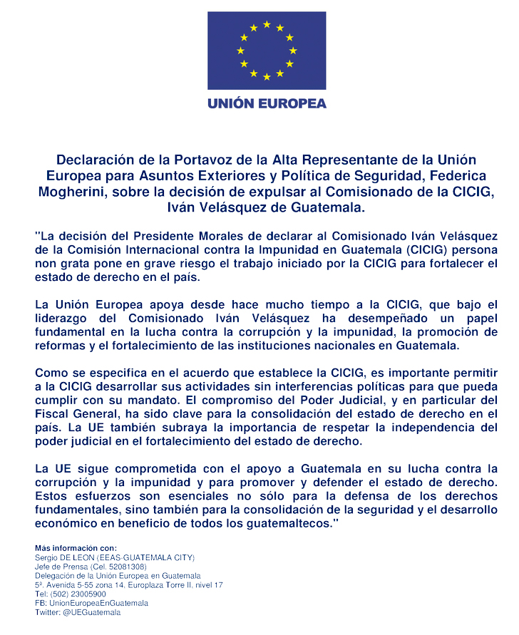 Guatemala, agosto 29 de 2017. Declaración de la Portavoz de la Alta Representante de la Unión Europea para Asuntos Exteriores y Política de Seguridad, Federica Mogherini, sobre la decisión de expulsar al Comisionado de la CICIG, Iván Velásquez de Guatemala.
