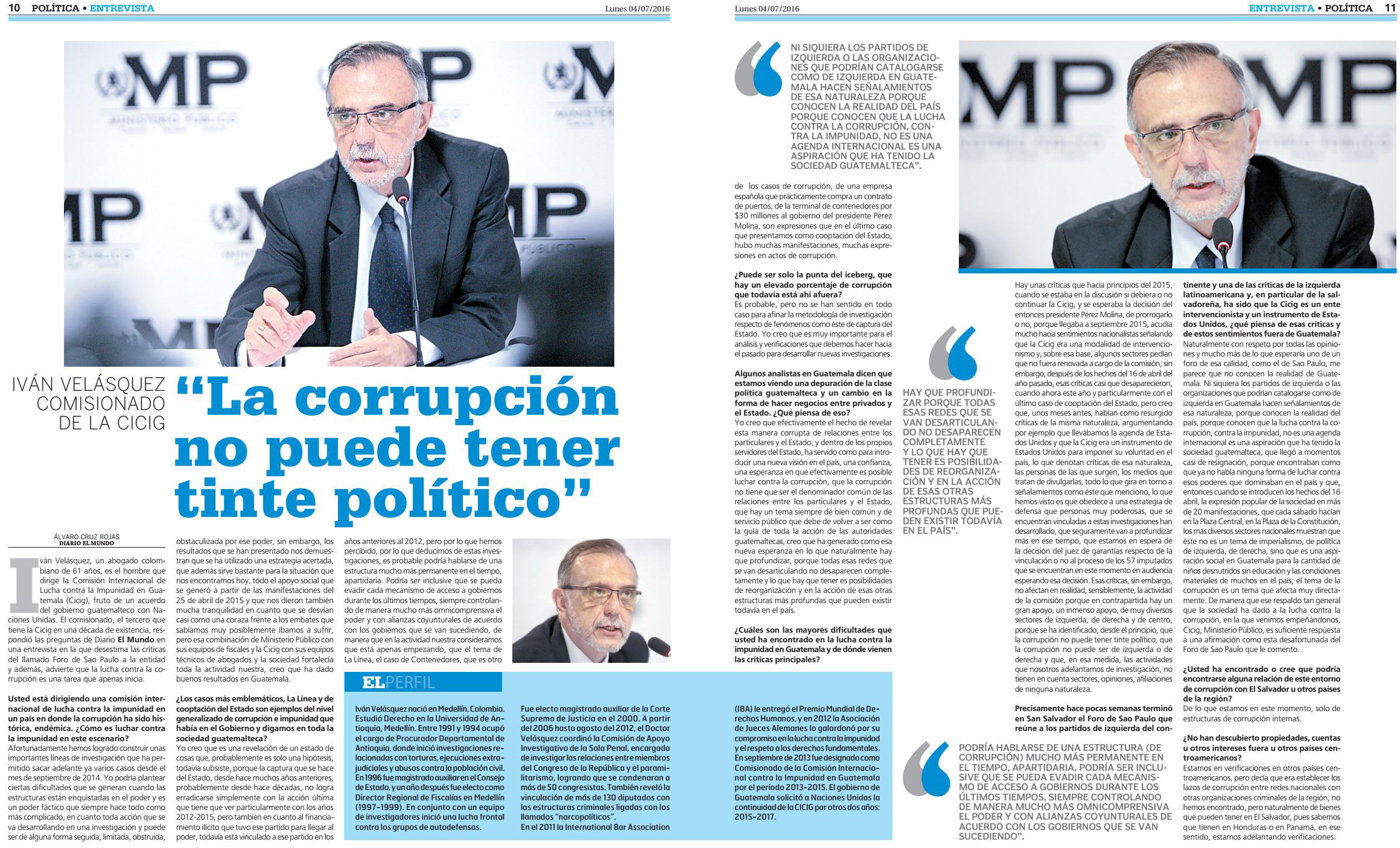 Iván Velásquez, un abogado colombiano de 61 años, es el hombre que dirige la Comisión Internacional de Lucha contra la Impunidad en Guatemala (Cicig), fruto de un acuerdo del gobierno guatemalteco con Naciones Unidas. El comisionado, el tercero que tiene la Cicig en una década de existencia, respondió las preguntas de Diario El Mundo en una entrevista en la que desestima las críticas del llamado Foro de Sao Paulo a la entidad y además, advierte que la lucha contra la corrupción es una tarea que apenas inicia.
