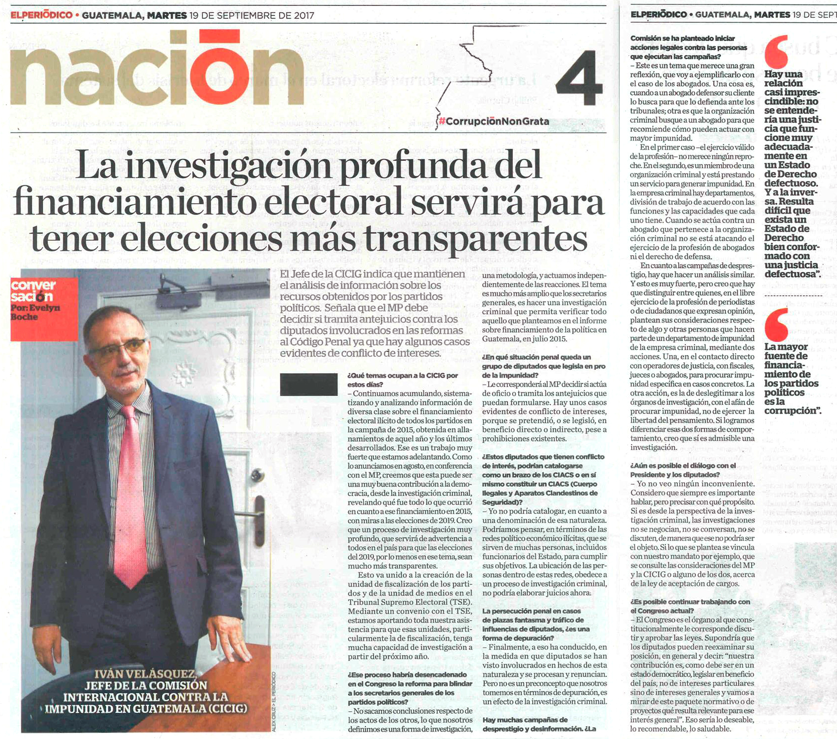– No sacamos conclusiones respecto de los actos de los otros, lo que nosotros definimos es una forma de investigación, una metodología, y actuamos independientemente de las reacciones. El tema es mucho más amplio que los secretarios generales, es hacer una investigación criminal que permita verificar todo aquello que planteamos en el informe sobre financiamiento de la política en Guatemala, en julio 2015.