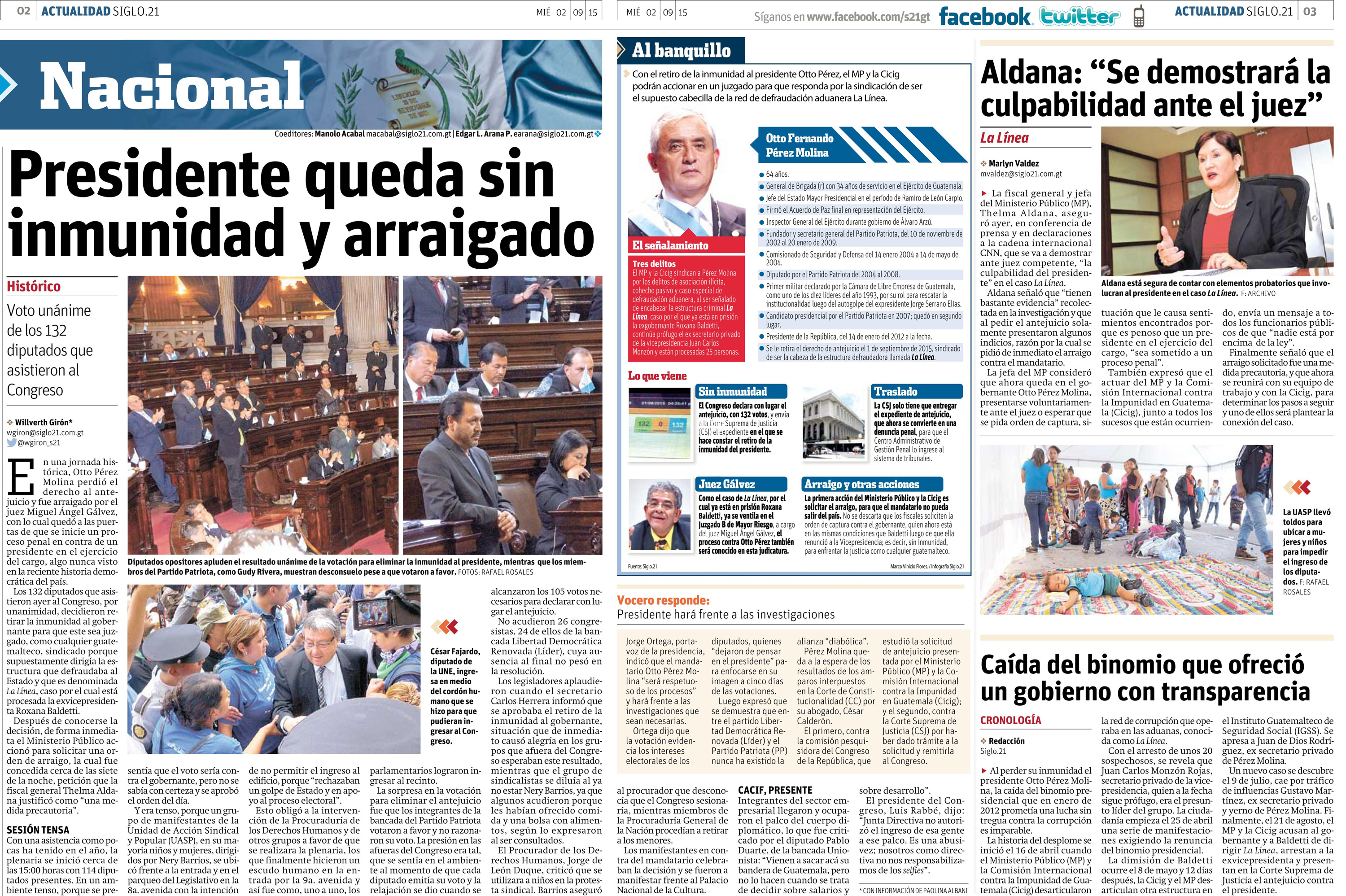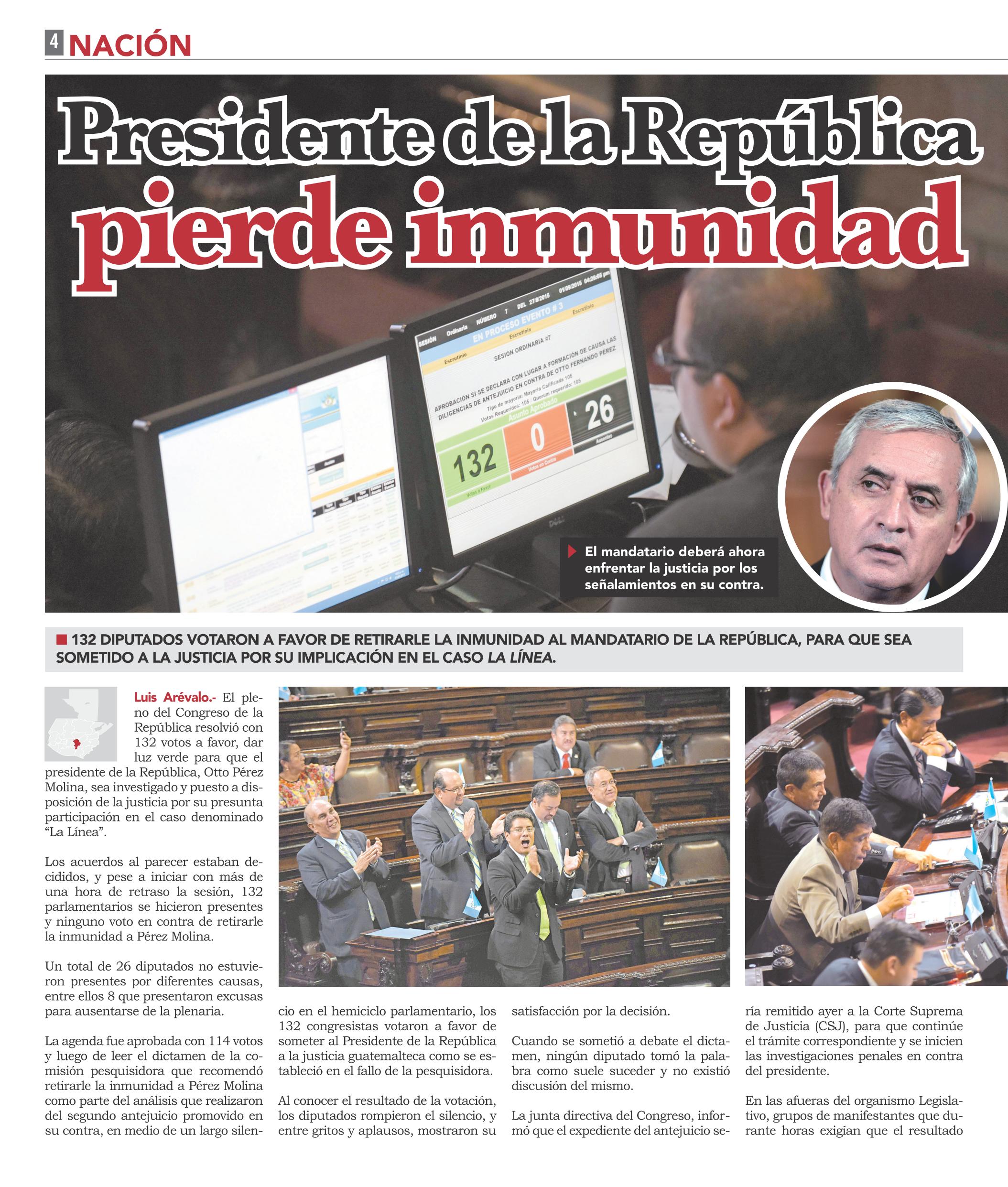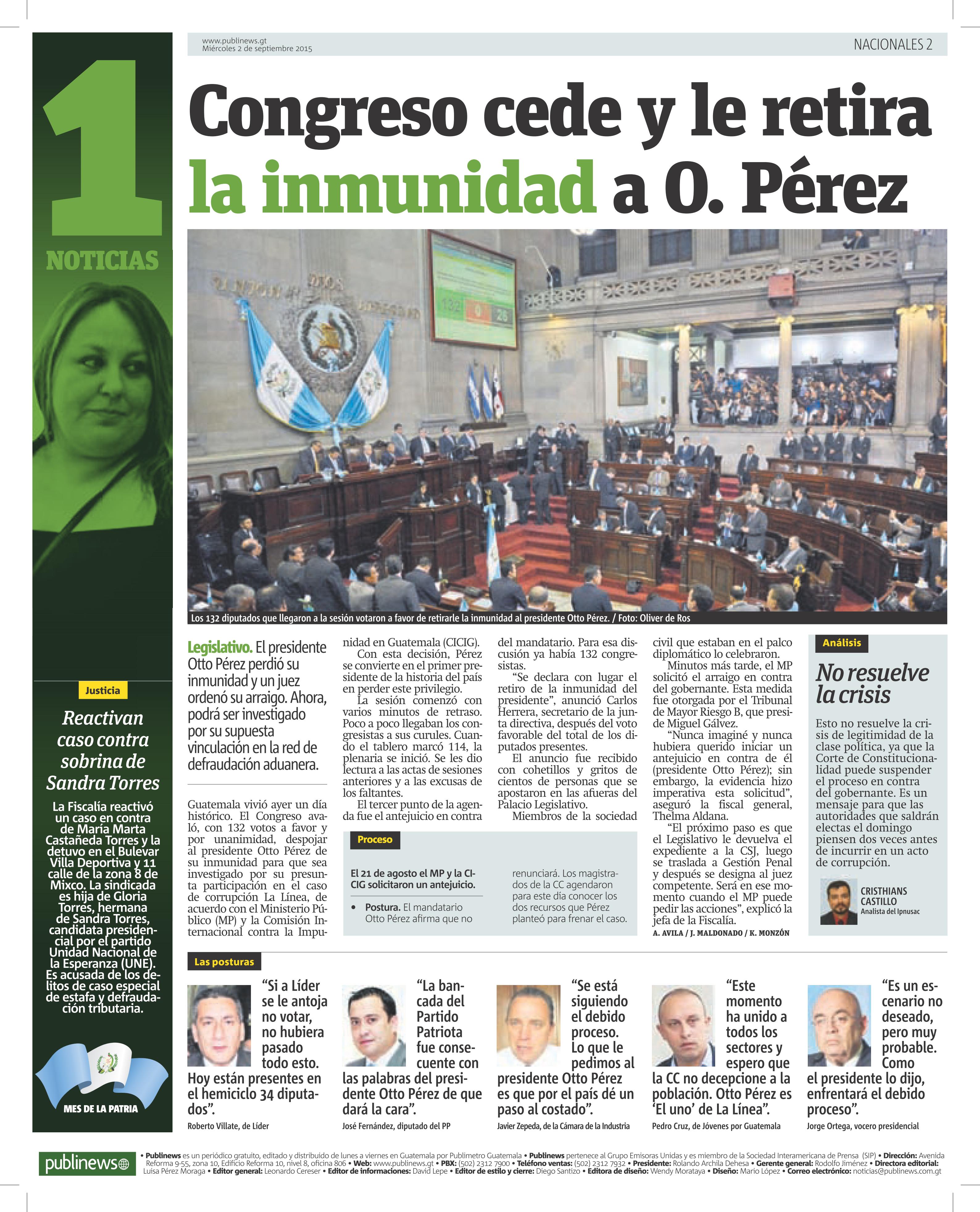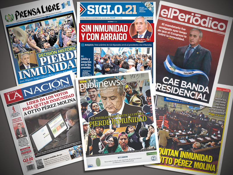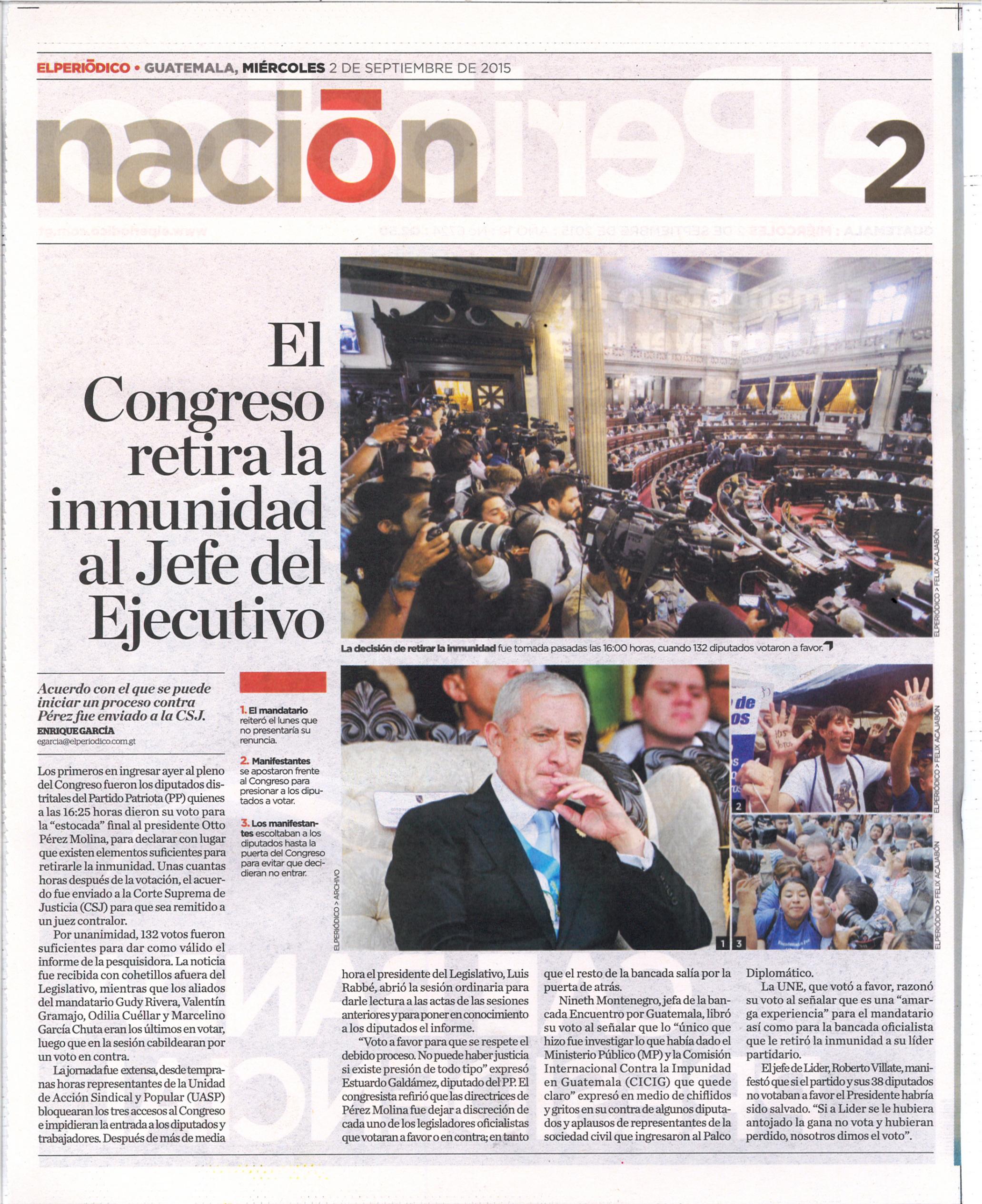 Guatemala, septiembre 02 de 2015. Los medios de comunicación destacaron la noticia sobre el retiro de inmunidad