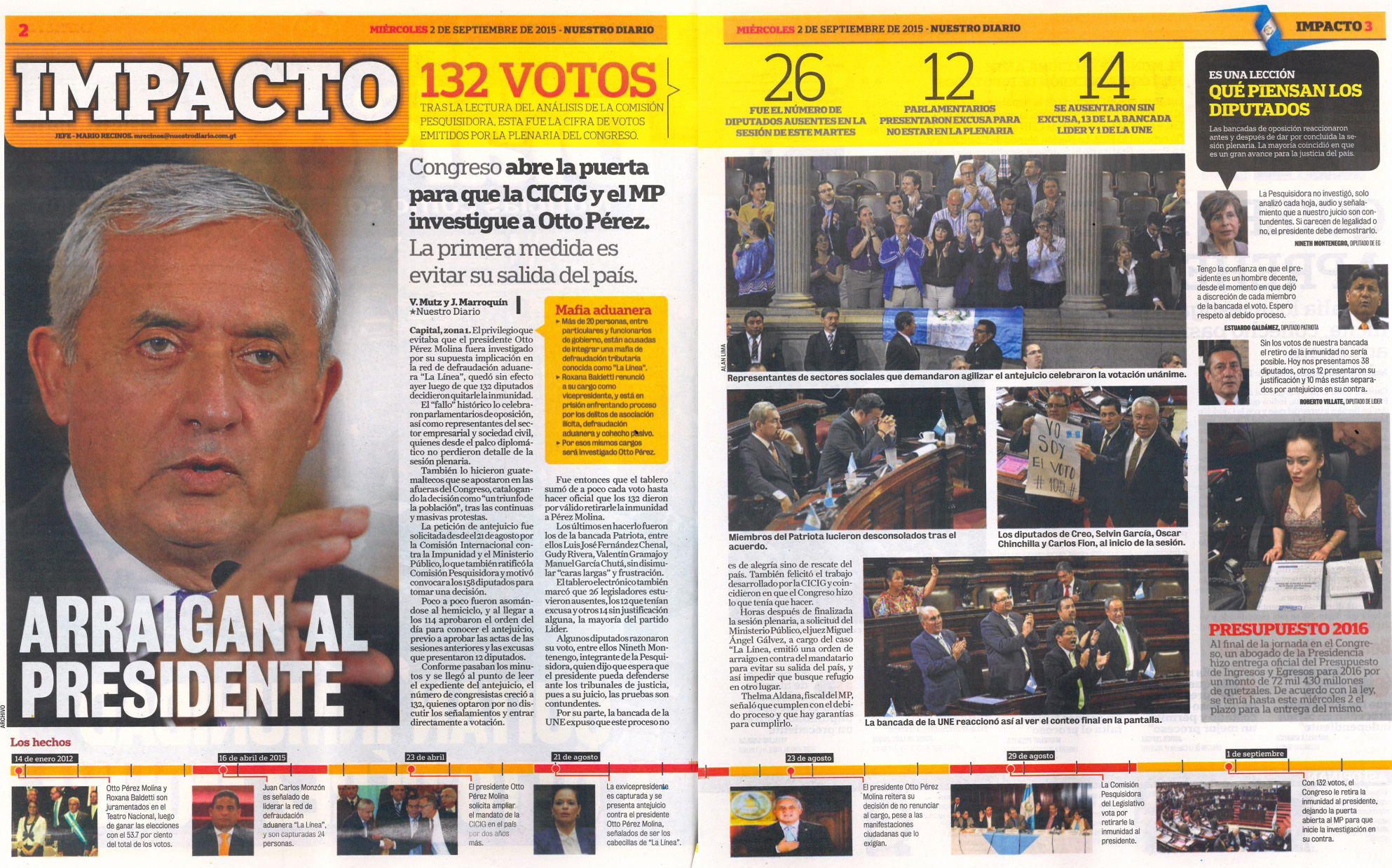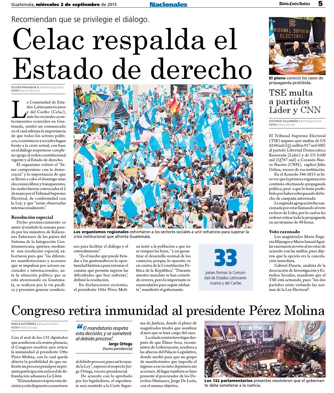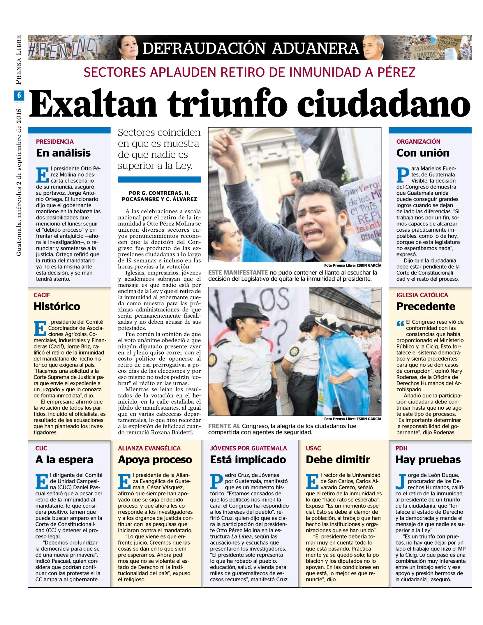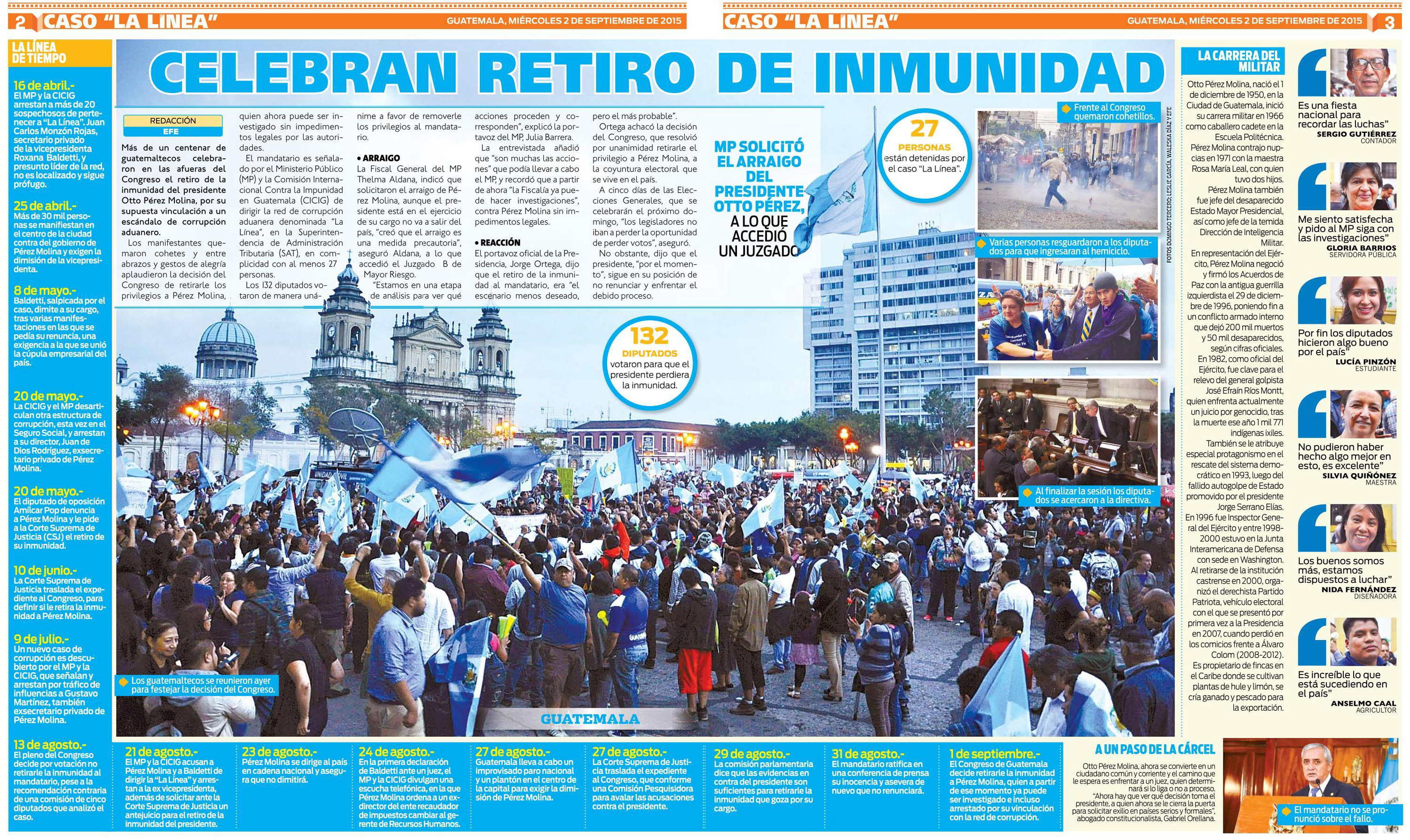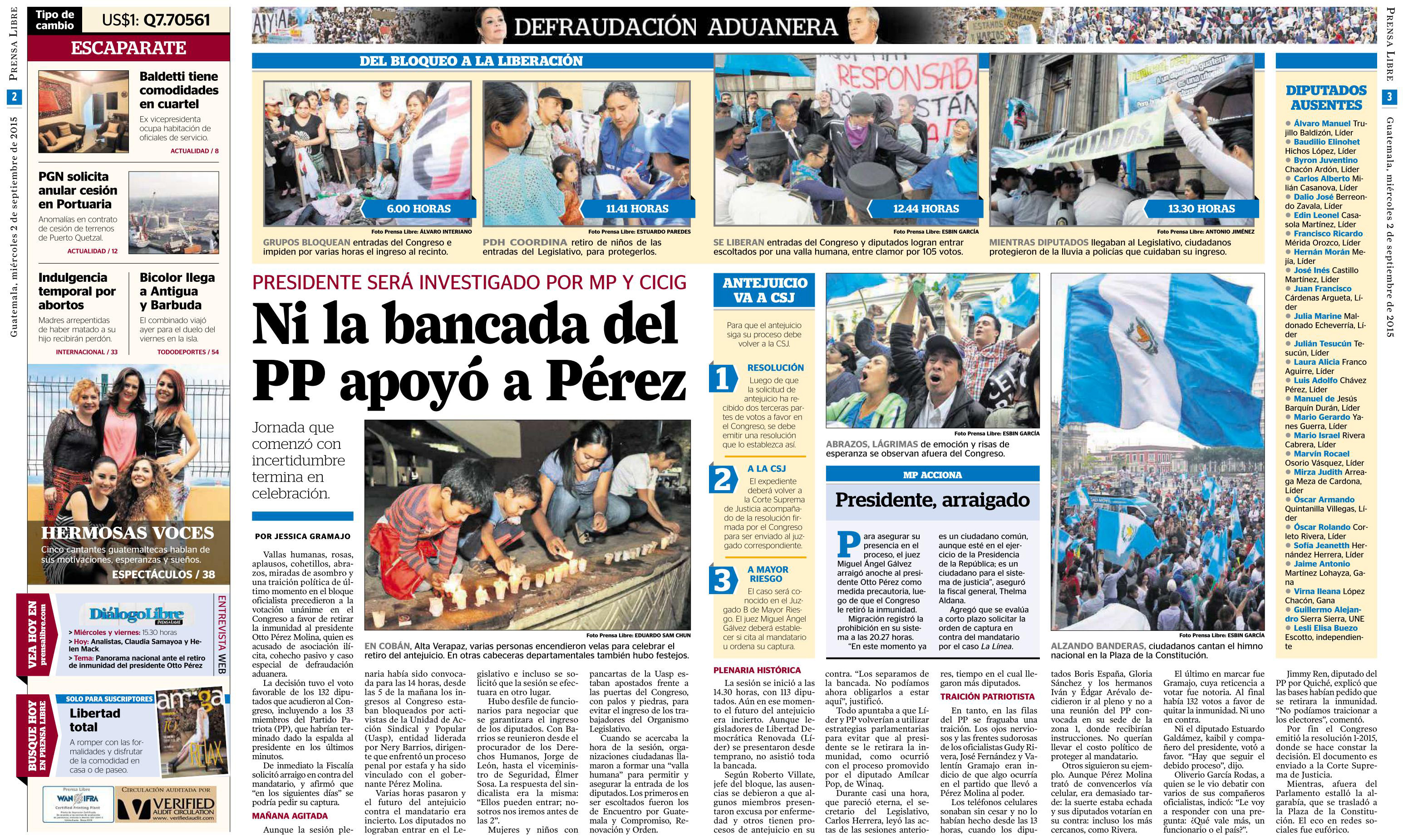 Guatemala, septiembre 02 de 2015. Los medios de comunicación destacaron la noticia sobre el retiro de inmunidad