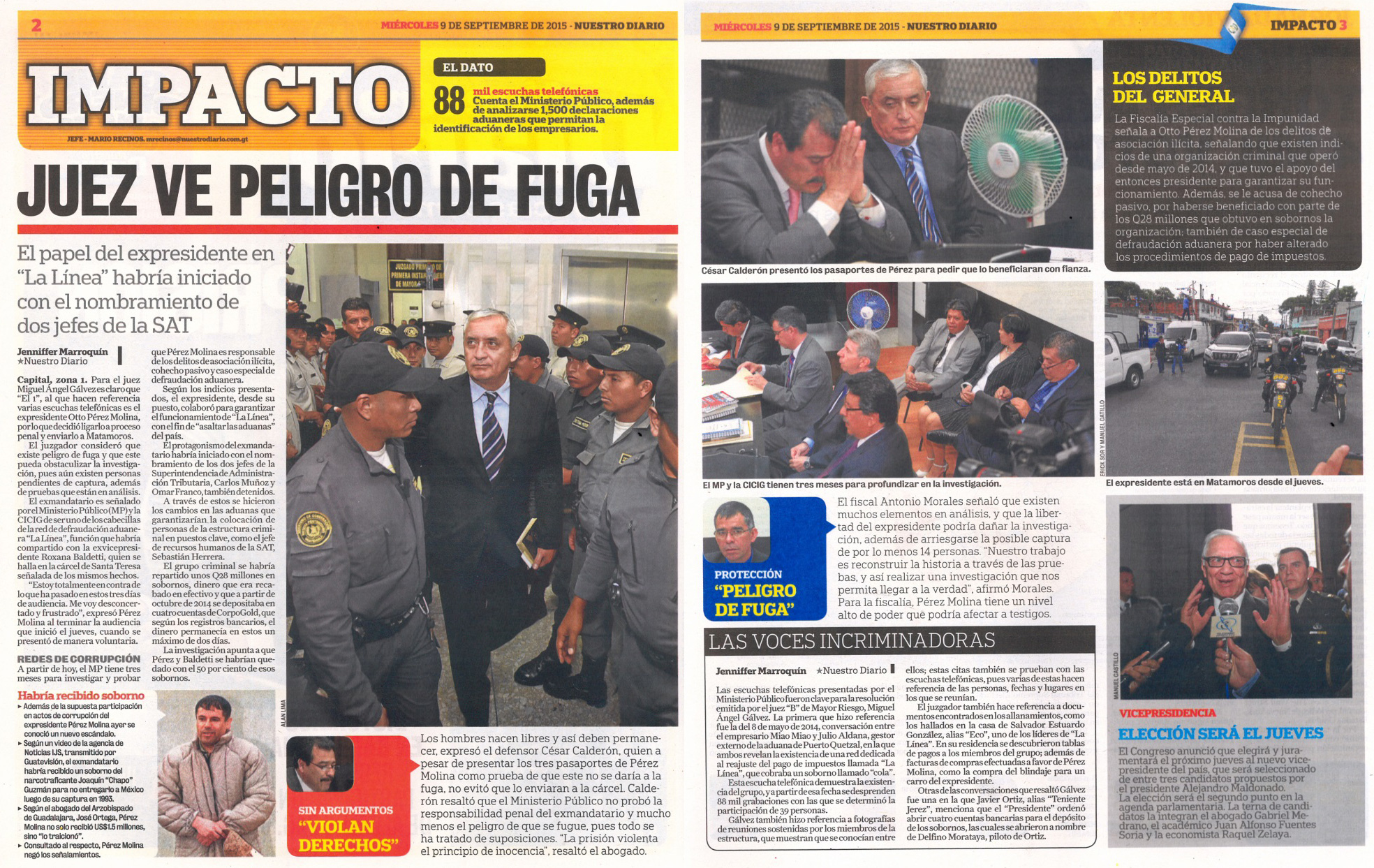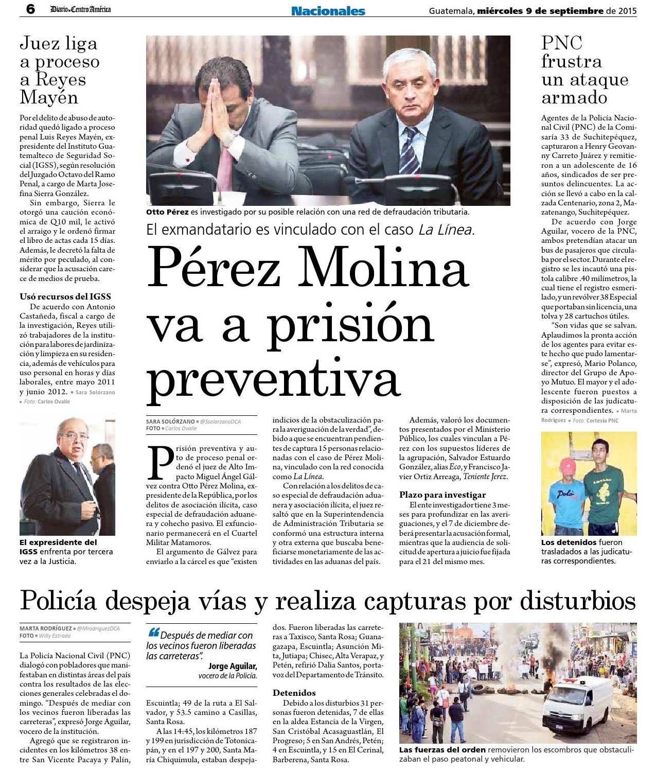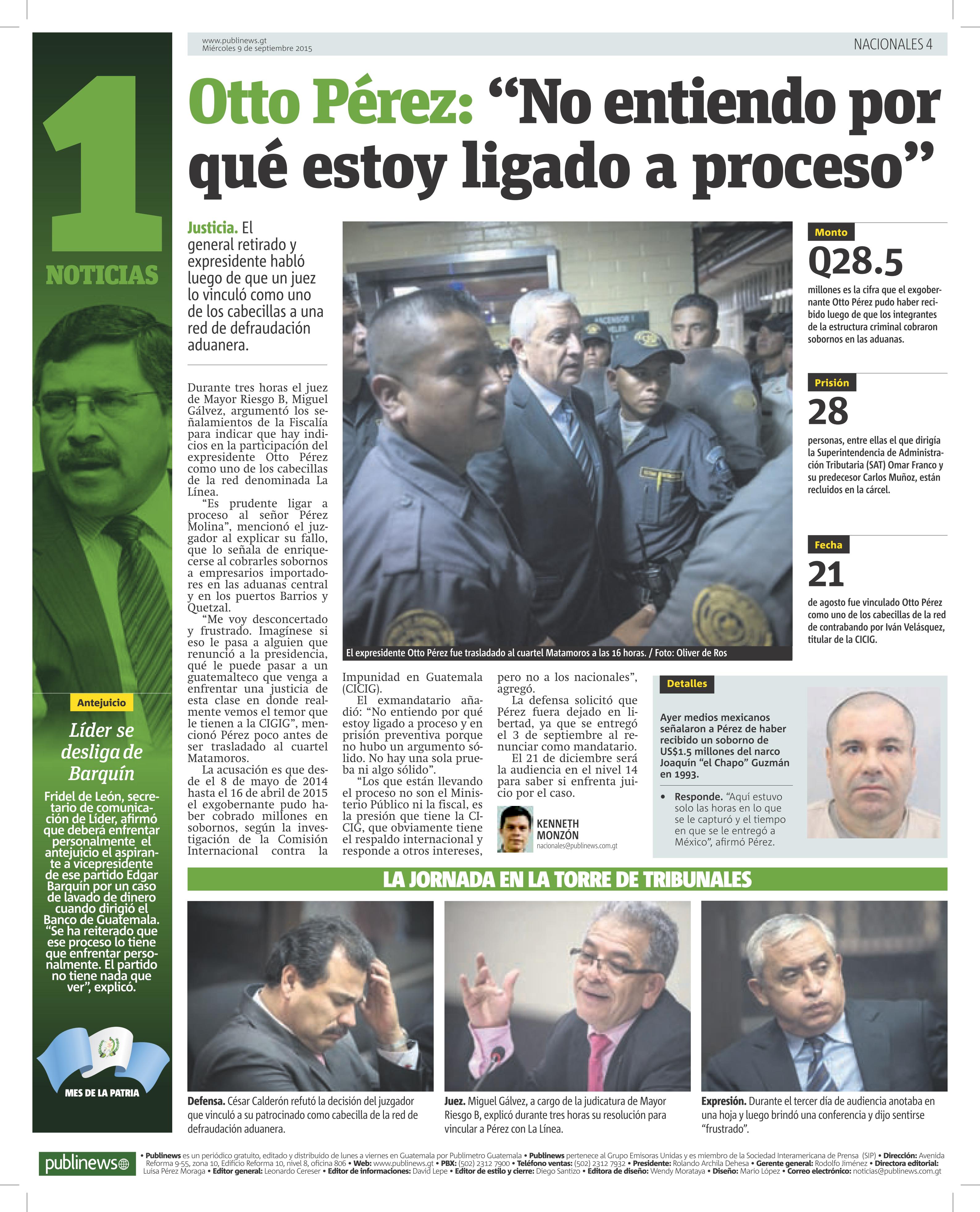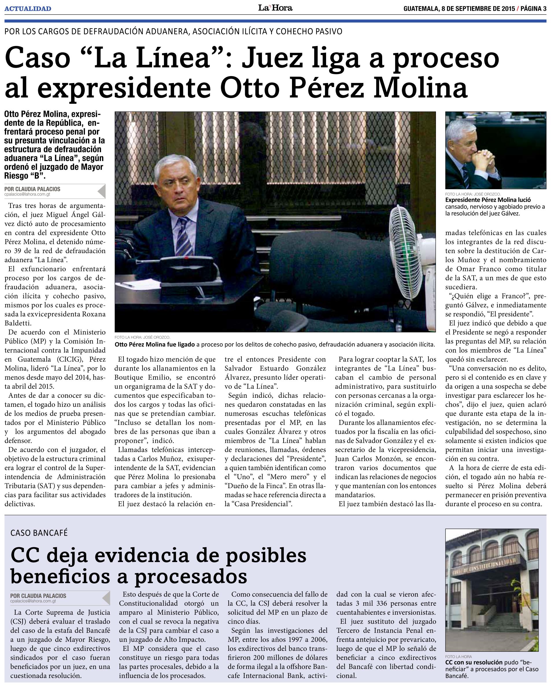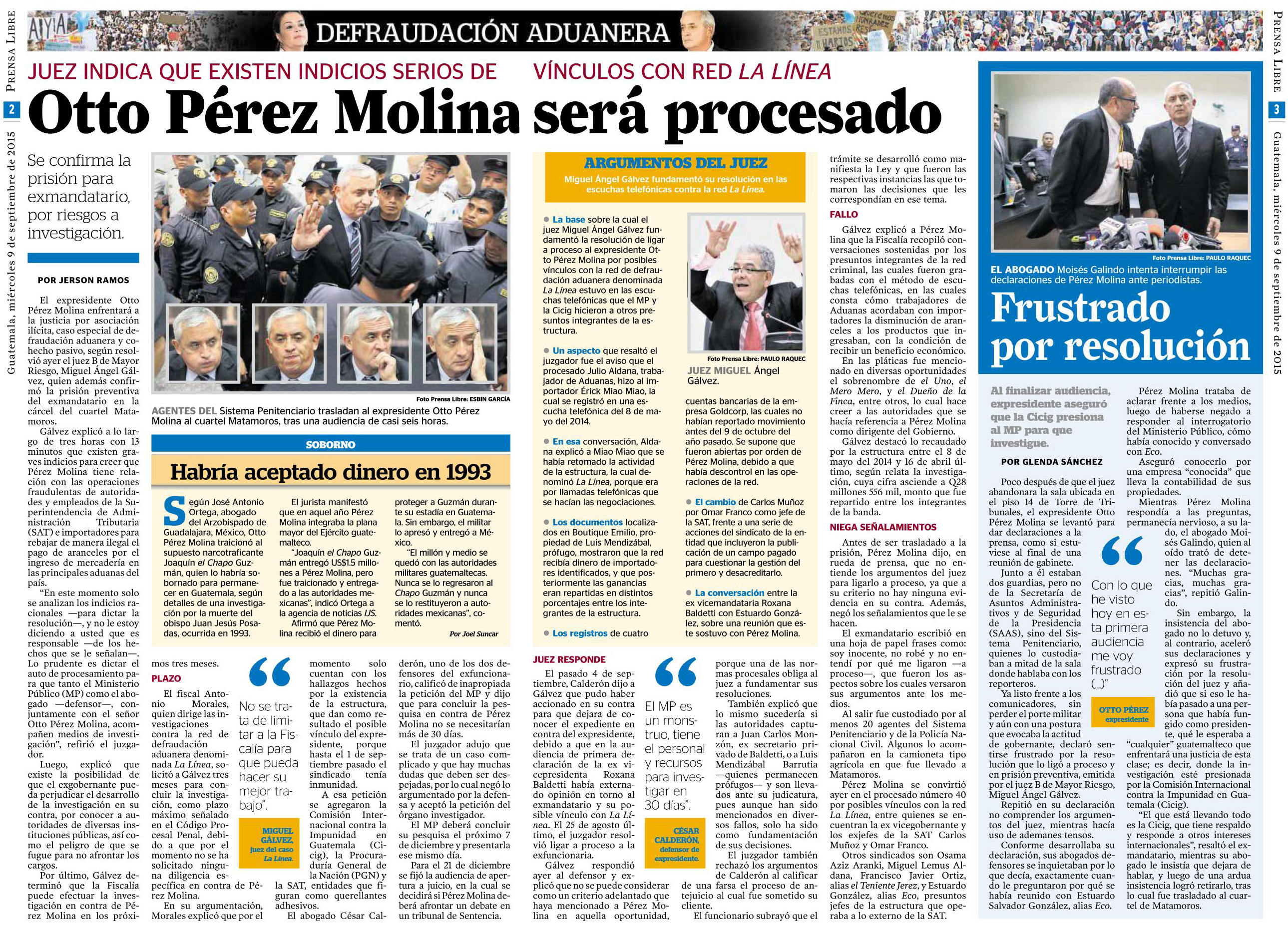 Guatemala, septiembre 09 de 2015. Los medios nacionales e internacionales resaltaron el fallo del juez Primero de Mayor Riesgo B, Miguel Ángel Gálvez, quien resolvió ligar a proceso y enviar a prisión preventiva al ex presidente Otto Pérez Molina, sindicado de los delitos de asociación ilícita, cohecho pasivo y caso especial de defraudación aduanera.(Se publica con fines informativos).