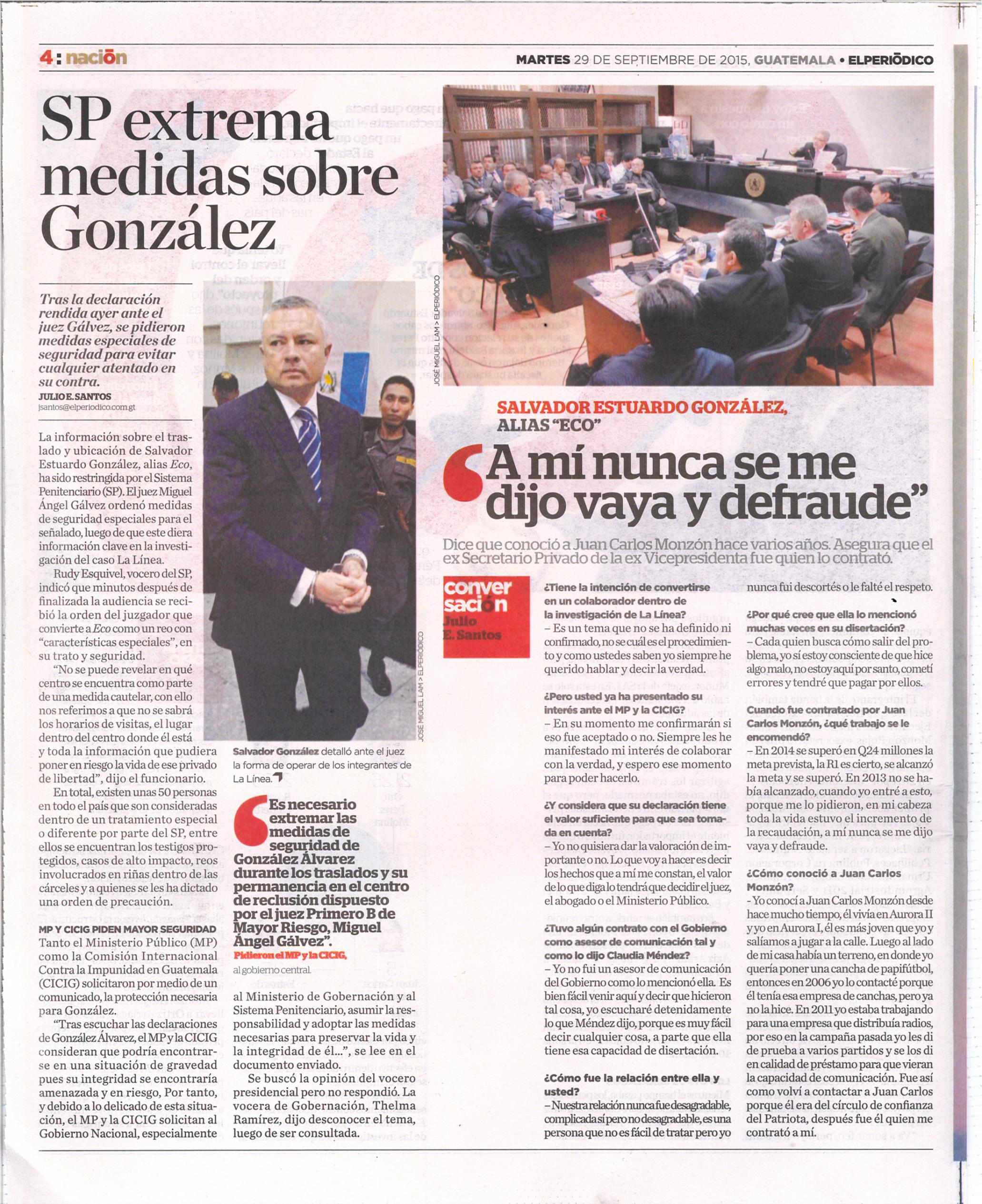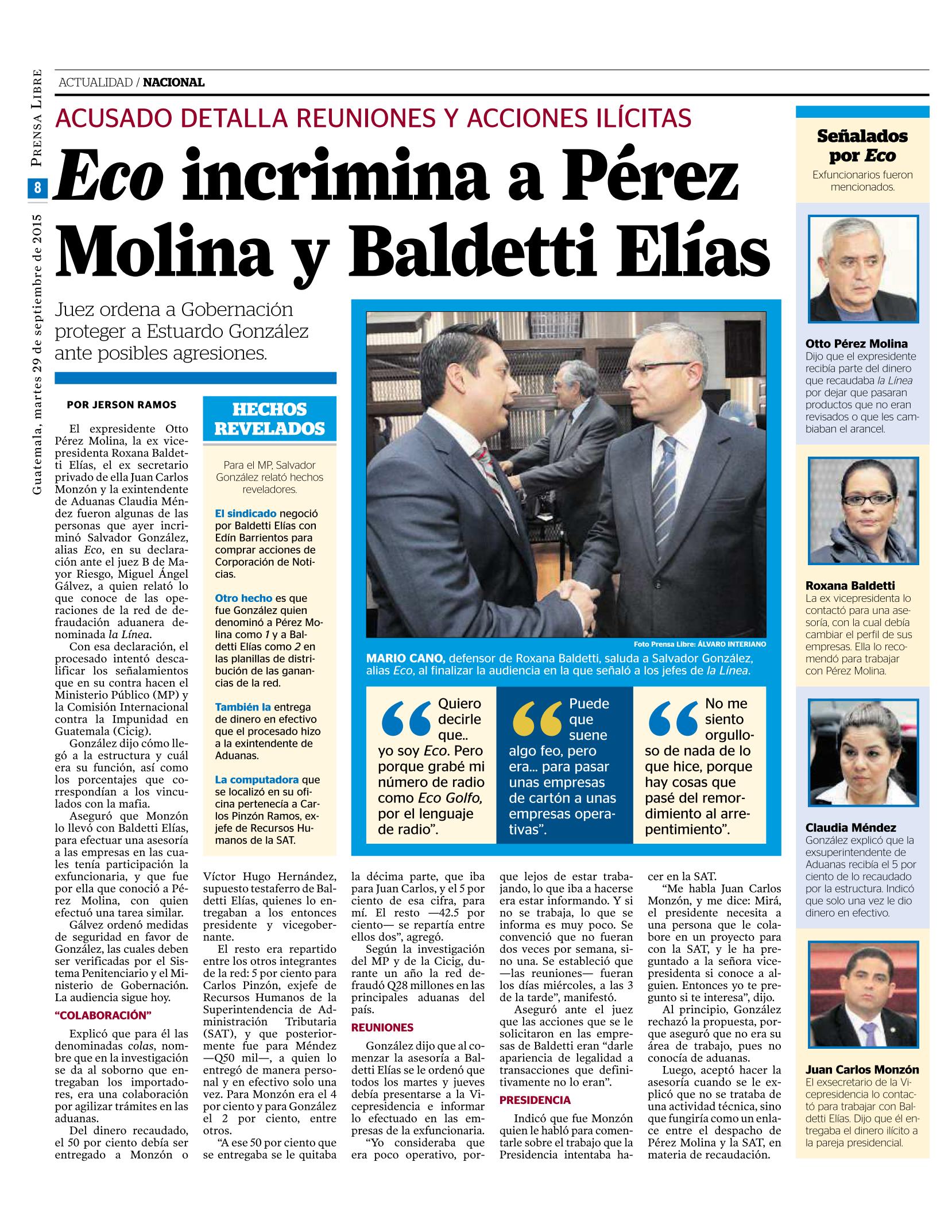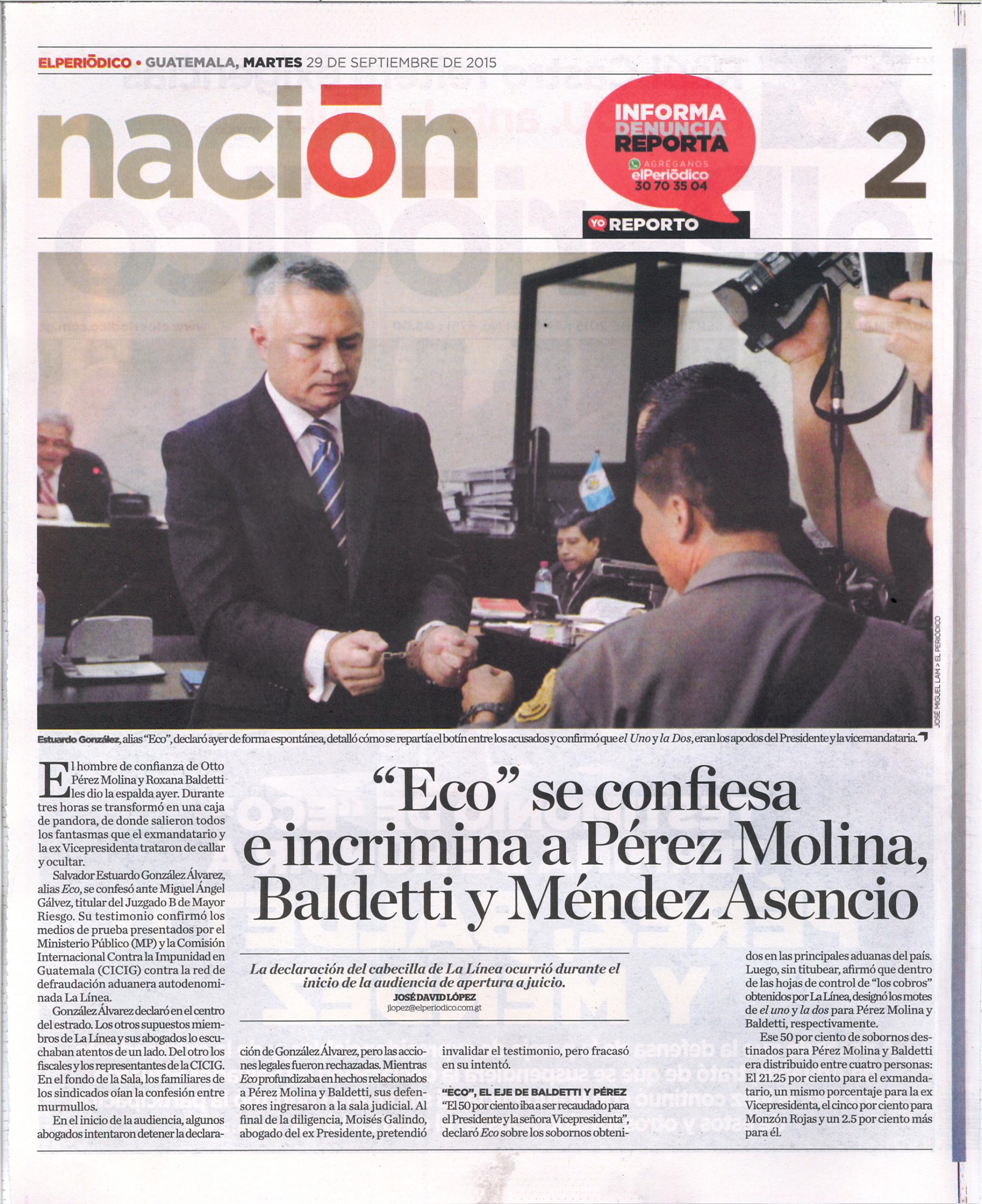 Guatemala, septiembre 29 de 2015. Los medios de comunicación resaltaron la declaración de Salvador Estuardo González, alias "Eco", quien detalló la manera en que operaba la estructura de defraudación aduanera "la línea", así como la participación dentro de esta organización criminal del ex presidente Otto Pérez Molina y la ex vicepresidenta Ingrid Roxana Baldetti.(Se publica con fines informativos).