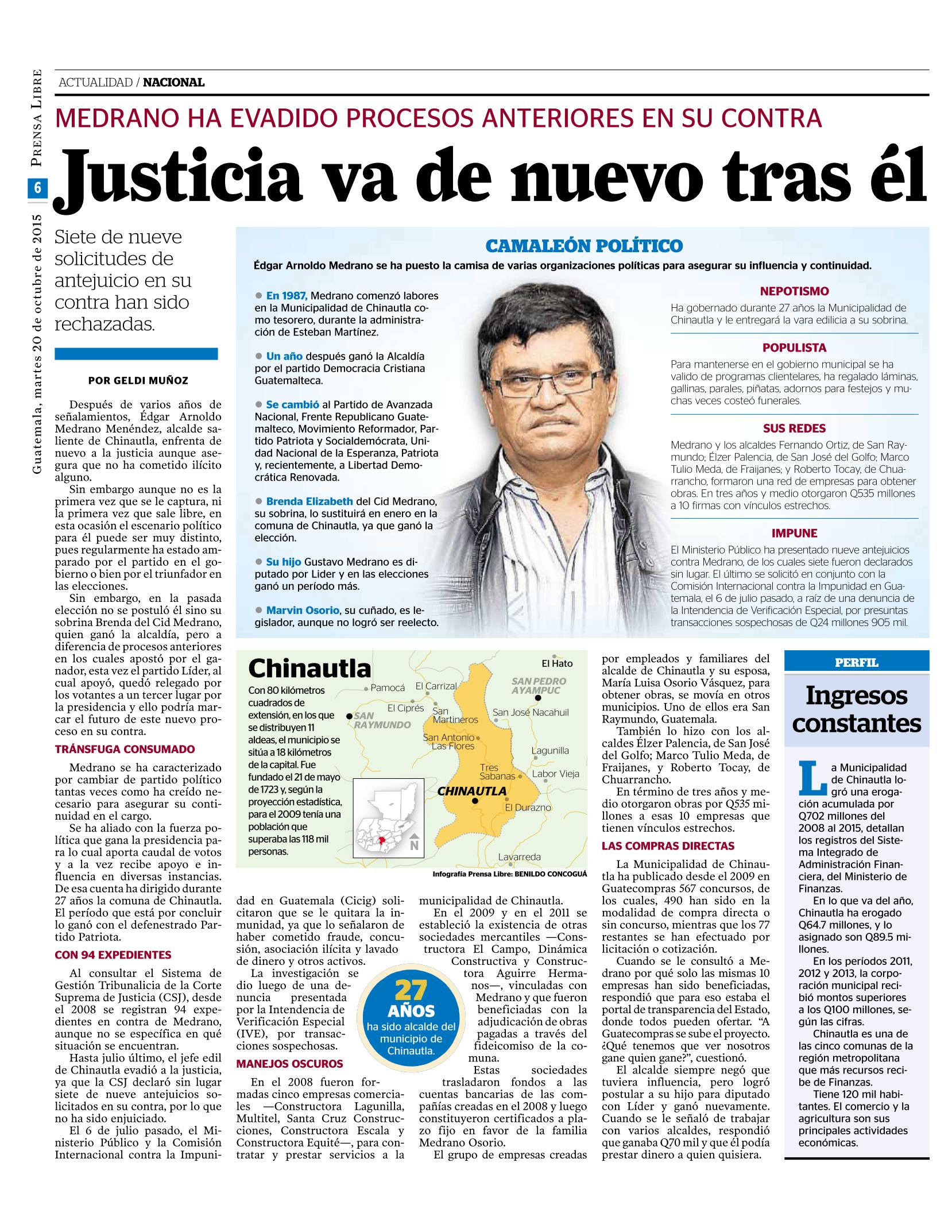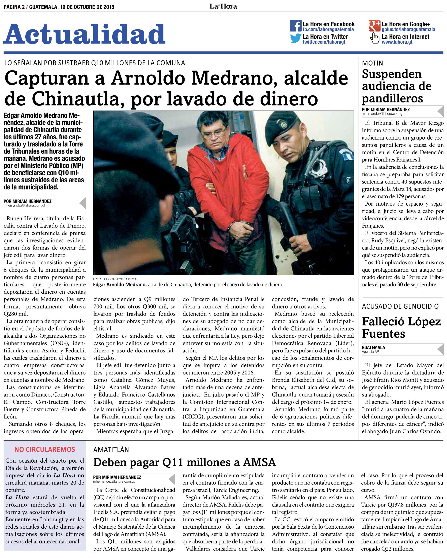 Guatemala, octubre 19 de 2015. Los medios de comunicación destacaron la captura del alcalde de Chinautla, Edgar