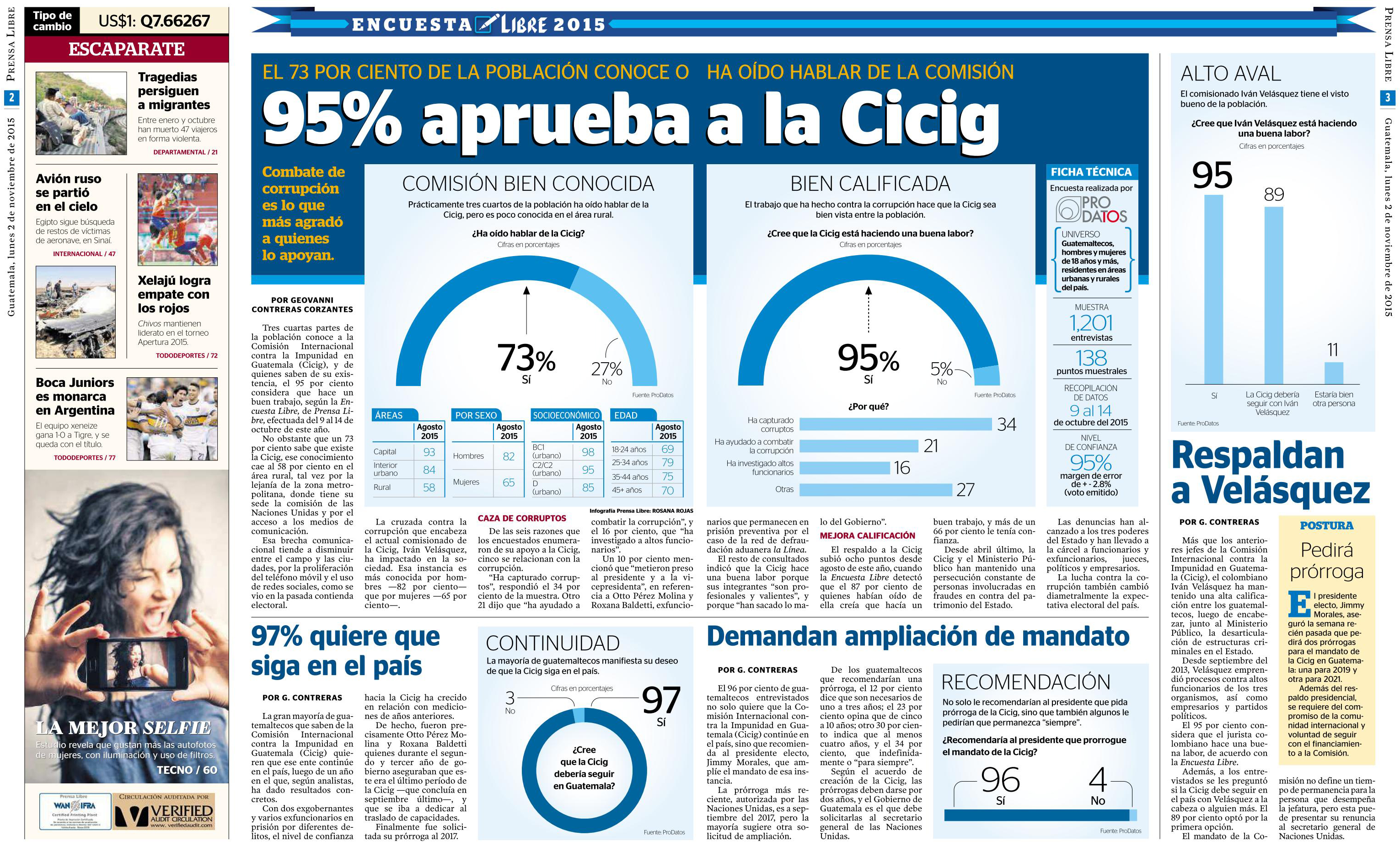 Guatemala, noviembre 03 de 2015. Una encuesta realizada por el periódico Prensa Libre a nivel nacional reveló que el 95% de los guatemaltecos aprueba la labor de la CICIG y del Comisionado Iván Velásquez Gómez, en el combate contra la corrupción e impunidad en el país. (Se publica con fines informativos).