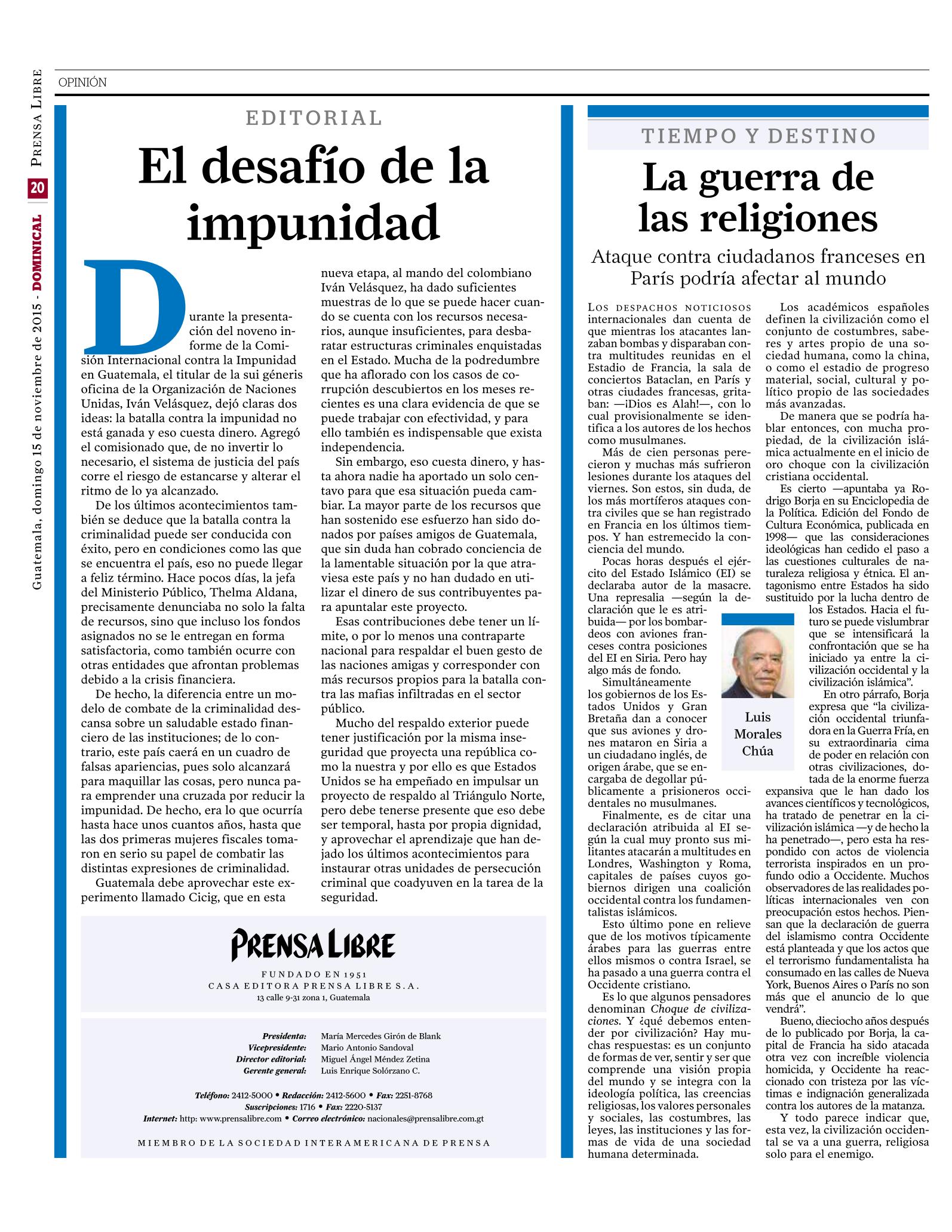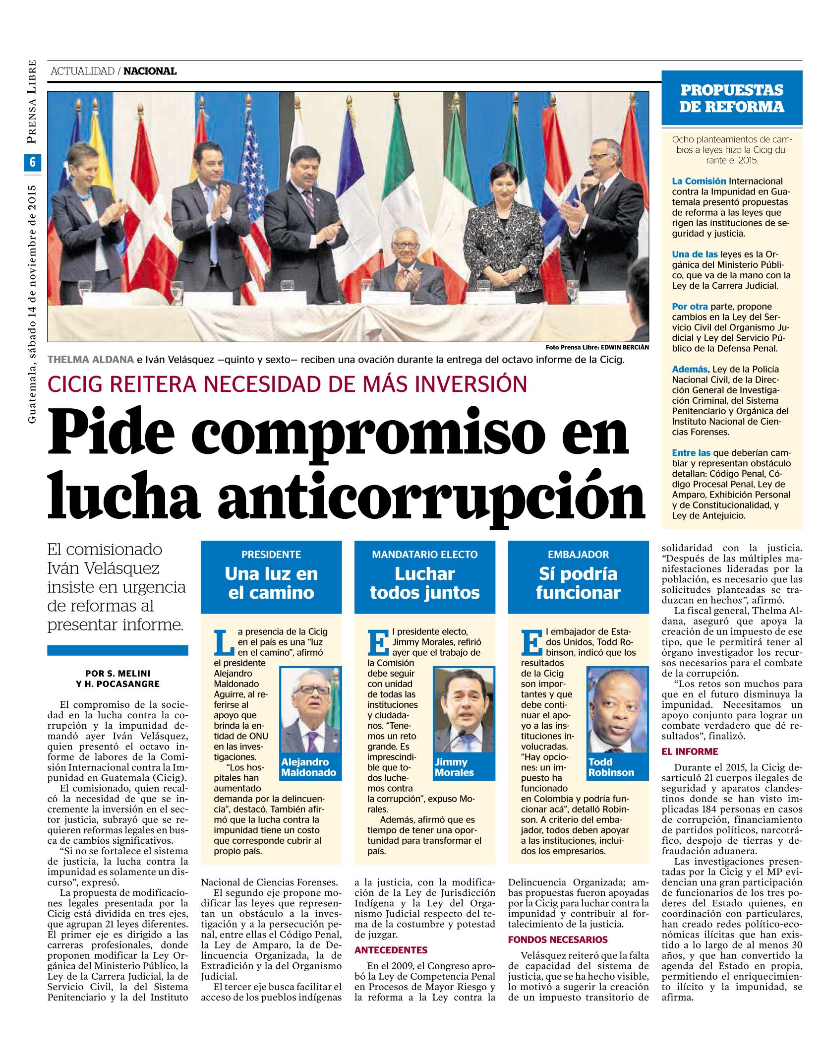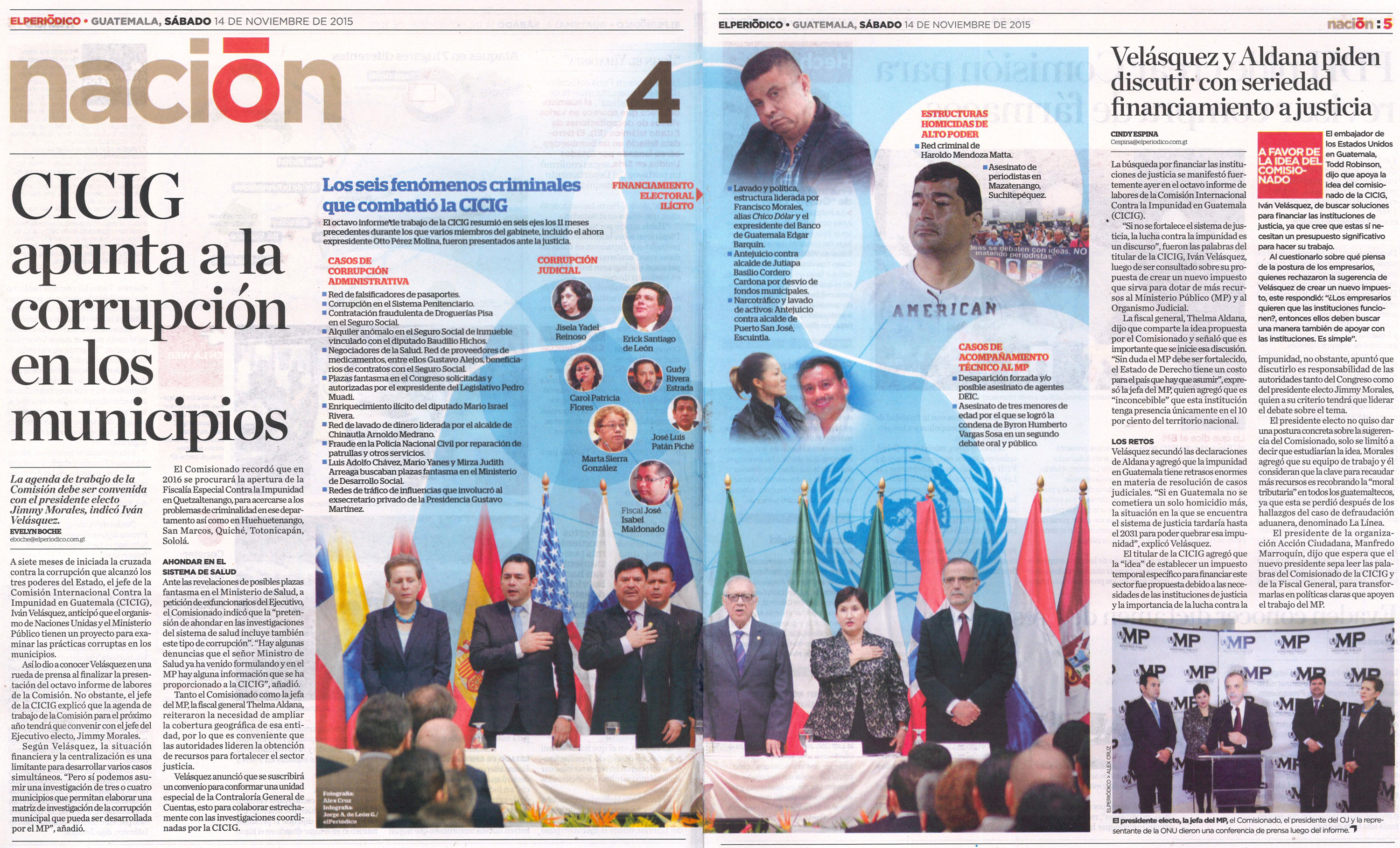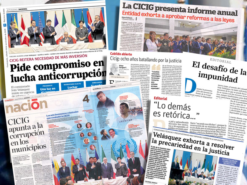Guatemala, noviembre 16 de 2015. Los medios de comunicación resaltaron el Octavo Informe de Labores de la CICIG, que destacó los avances del cumplimiento del plan de trabajo 2013-2015 de la Comisión, en el cual se priorizaron cinco fenómenos criminales para la investigación. (Se publica con fines informativos).