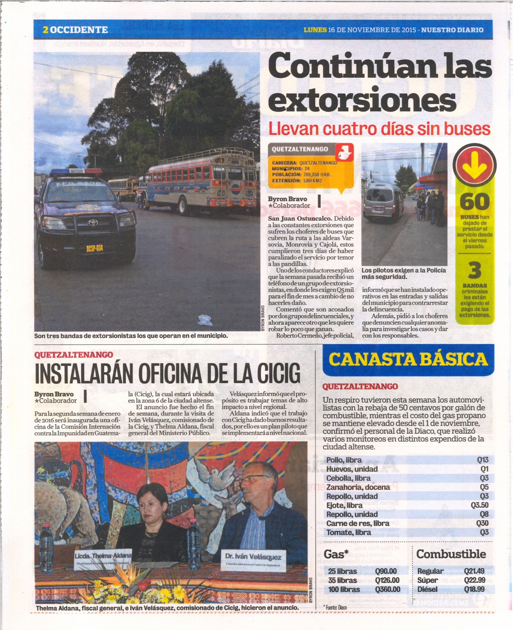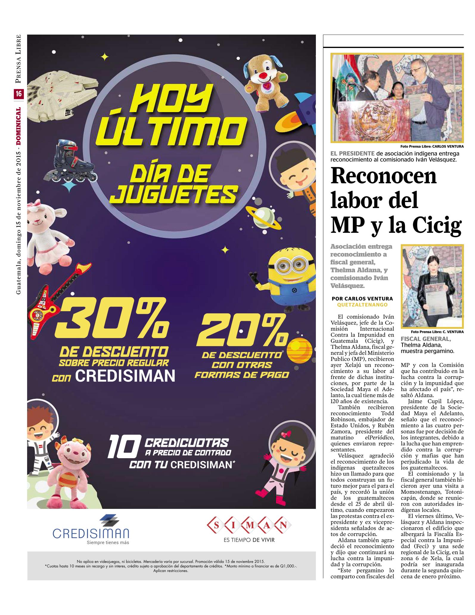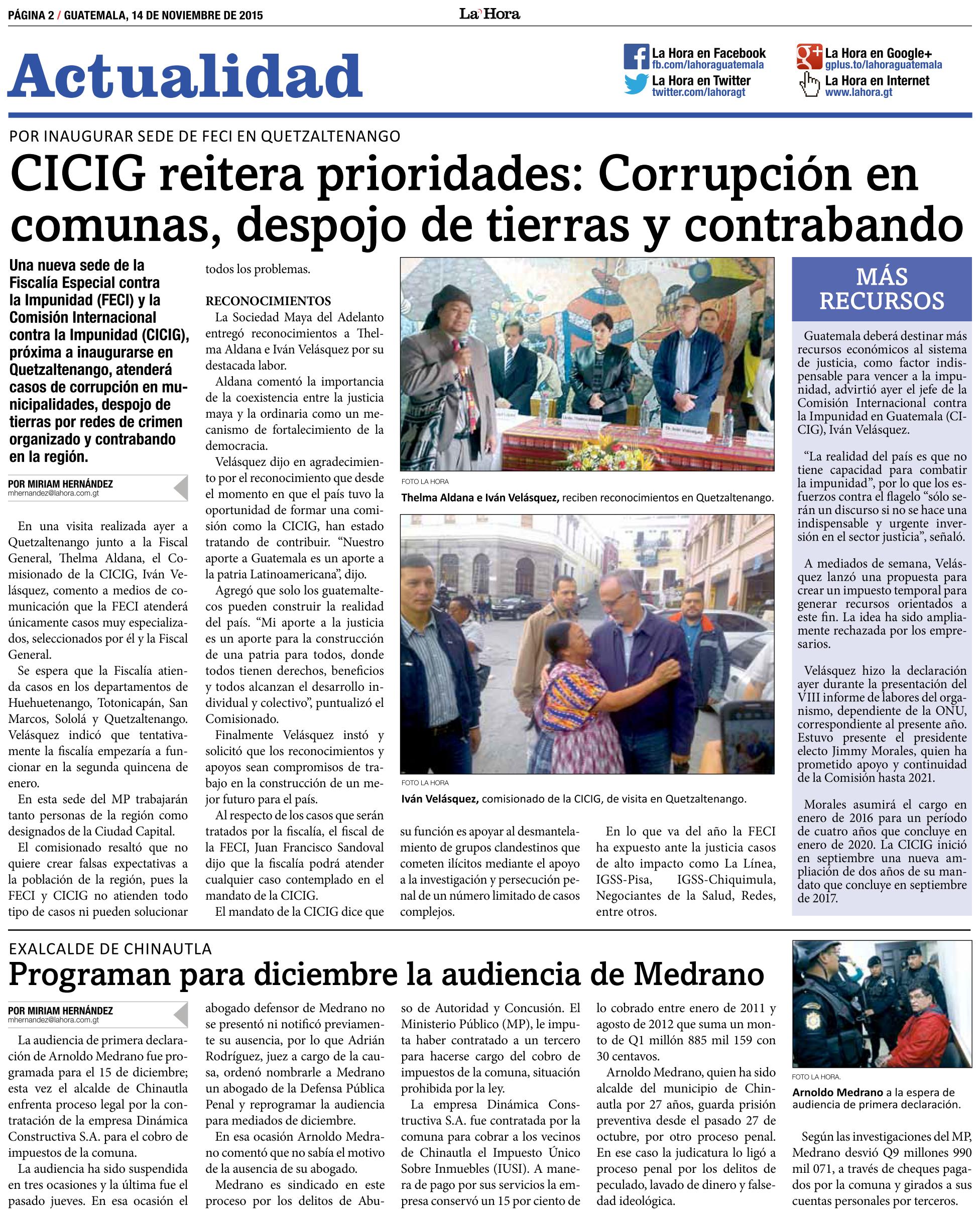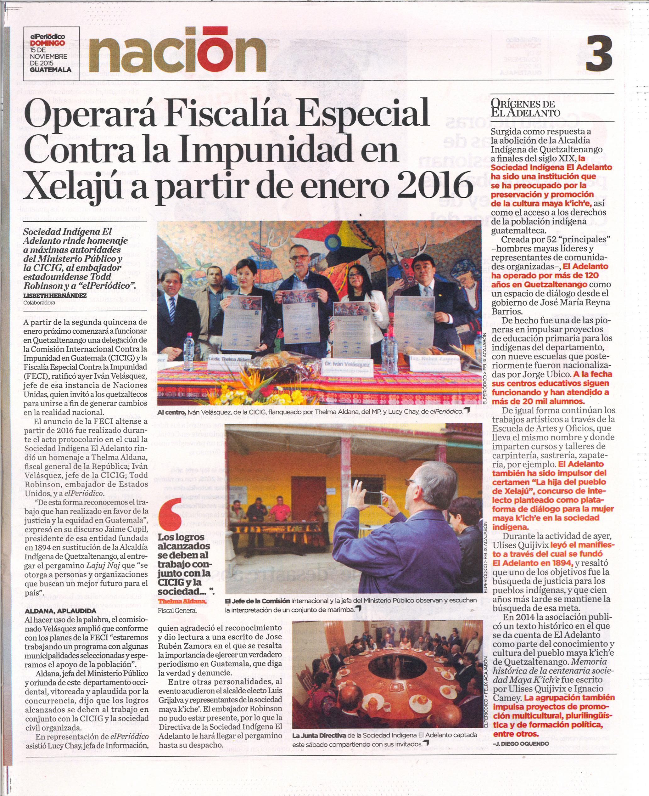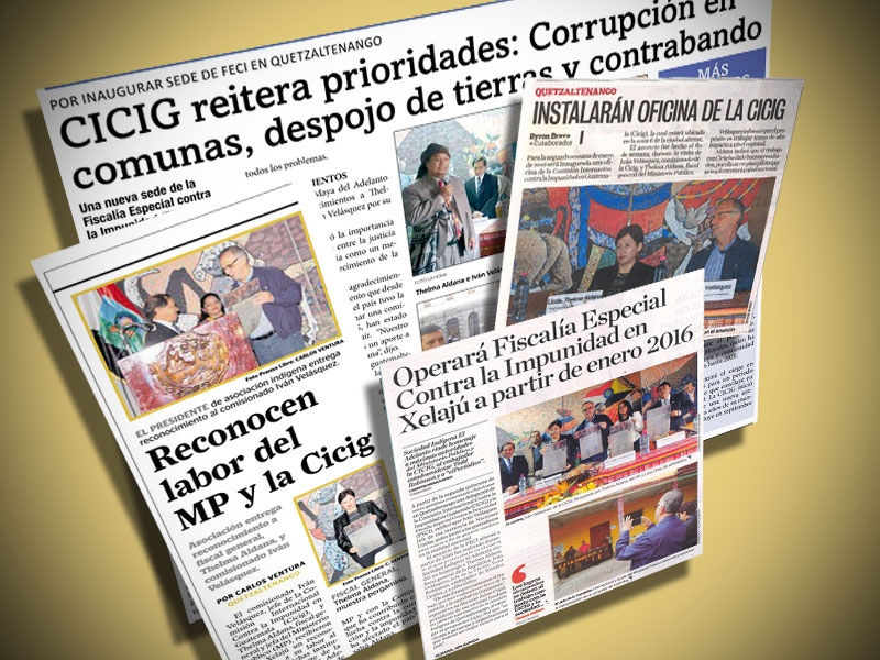 Guatemala, noviembre 16 de 2015. La visita que realizó en Quetzaltenango el Comisionado Iván Velásquez Gómez y la Fiscal General, Thelma Aldana, fue destacada por los medios de comunicación. El propósito de la llegada del Comisionado y de la Fiscal fue para verificar las instalaciones donde funcionará una nueva sede de la Fiscalía Especial contra la Impunidad (FECI). También la Sociedad Maya les entregó un reconocimiento por su labor en la lucha contra la corrupción e impunidad. (Se publica con fines informativos).