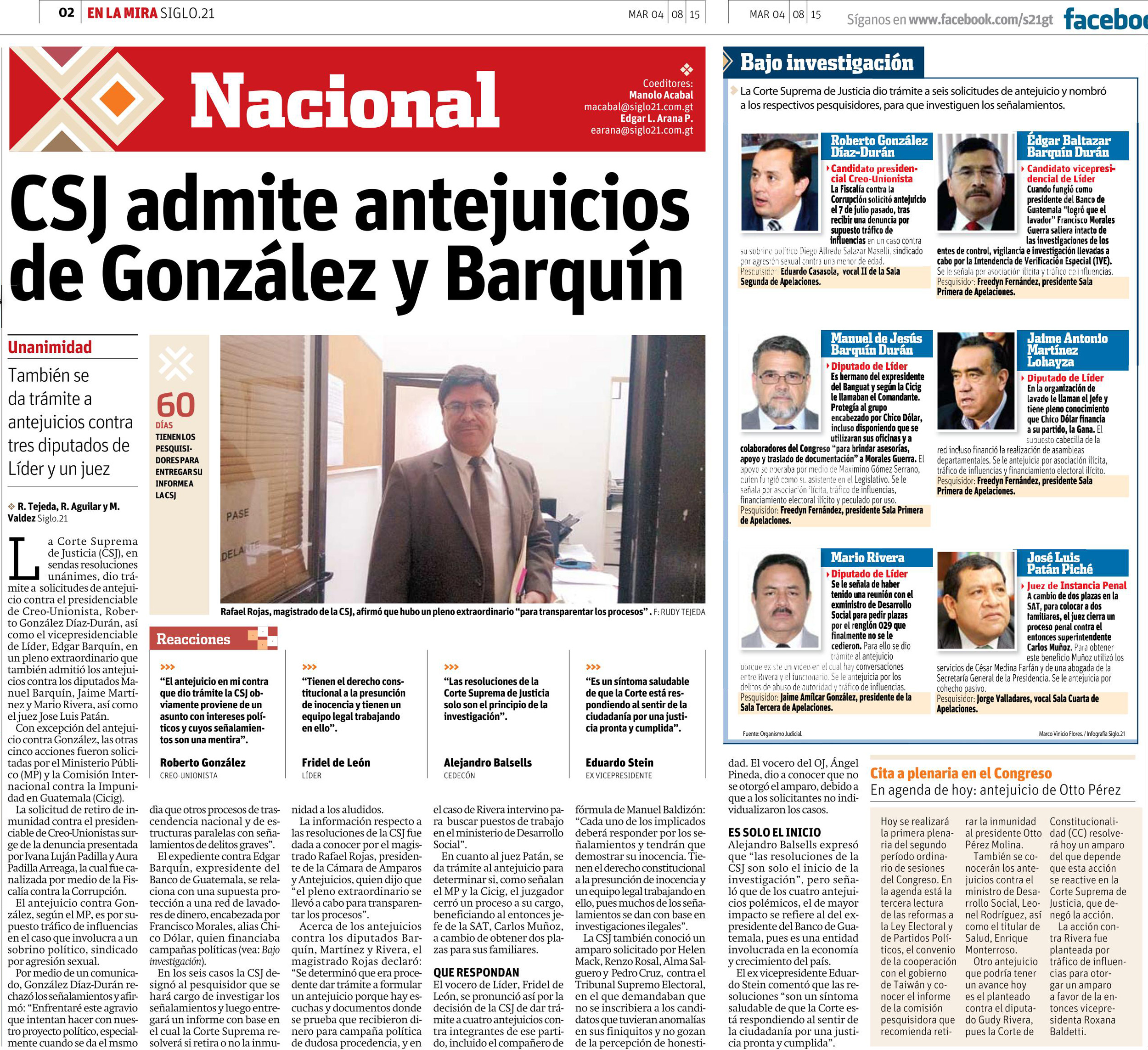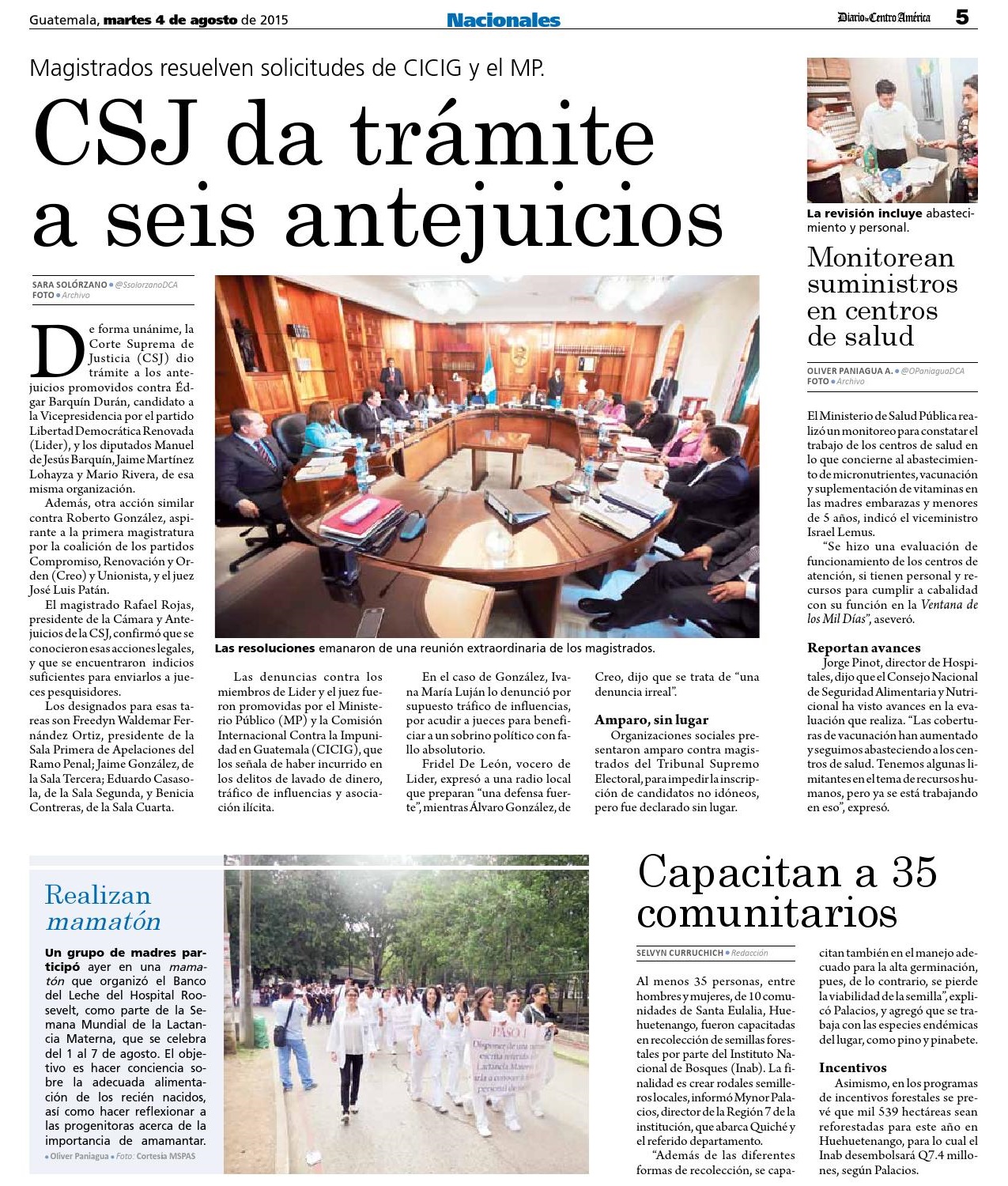 Guatemala, agosto 06 de 2015. Los medios de comunicación resaltaron la forma unánime en que la Corte Suprema de Justicia dio trámite a algunos antejuicios. (Se publica con fines informativos).
