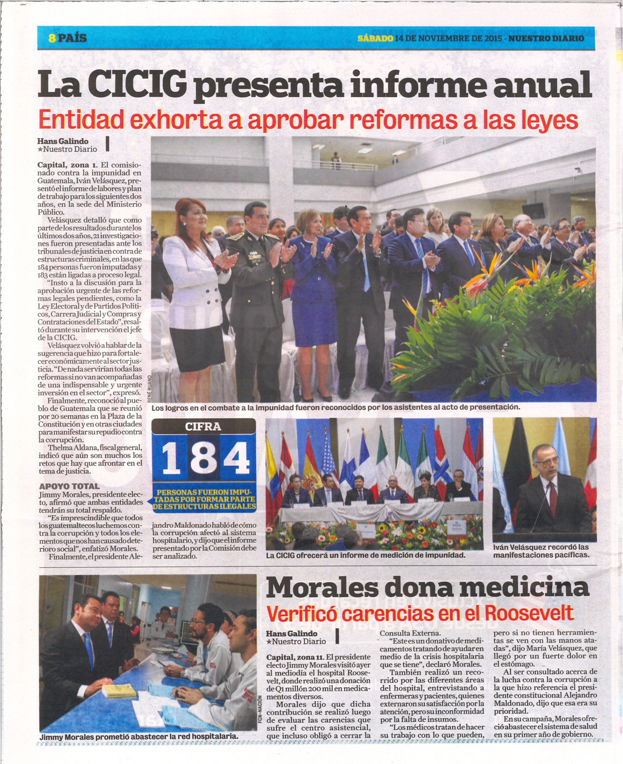 Los medios de comunicación resaltaron el Octavo Informe de Labores de la CICIG, que destacó los avances del cumplimiento del plan de trabajo 2013-2015 de la Comisión, en el cual se priorizaron cinco fenómenos criminales para la investigación. (Se publica con fines informativos).